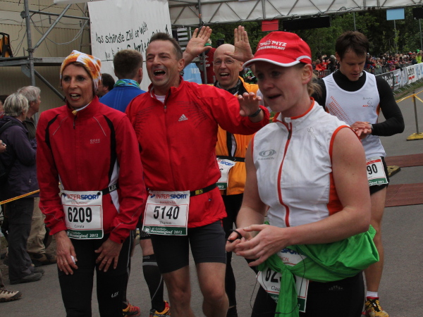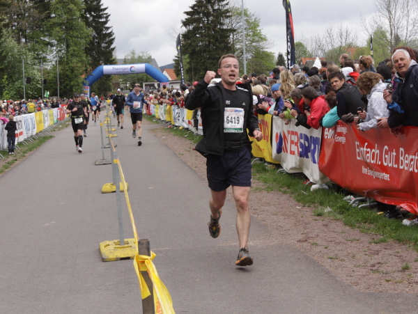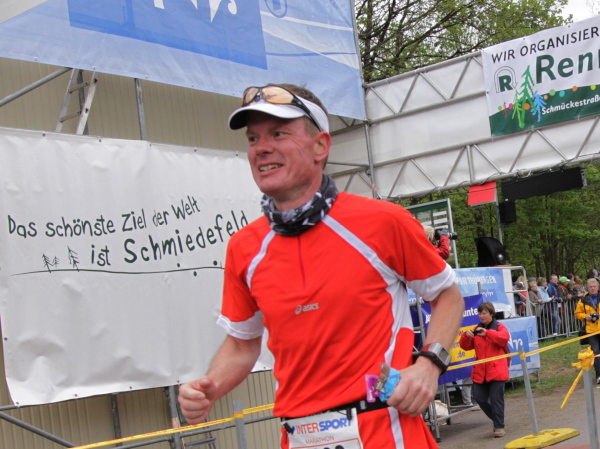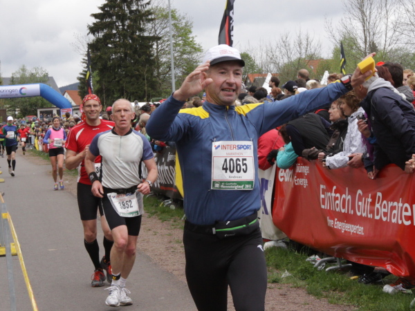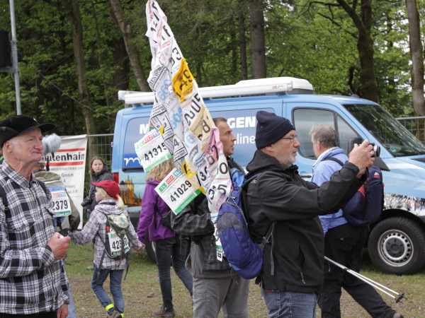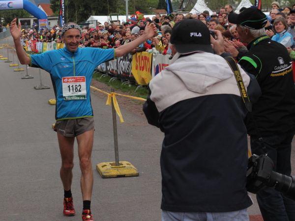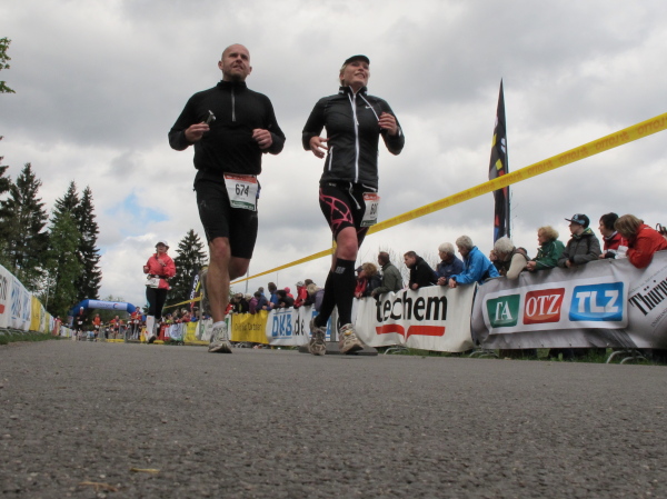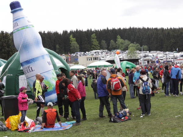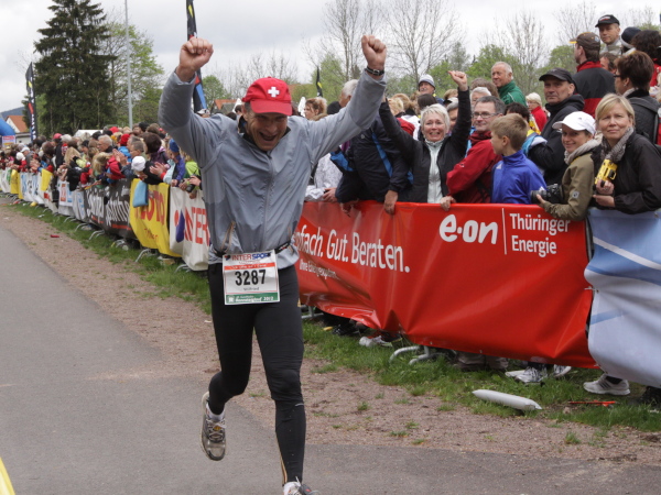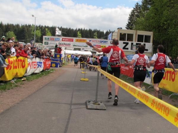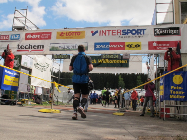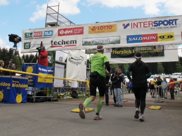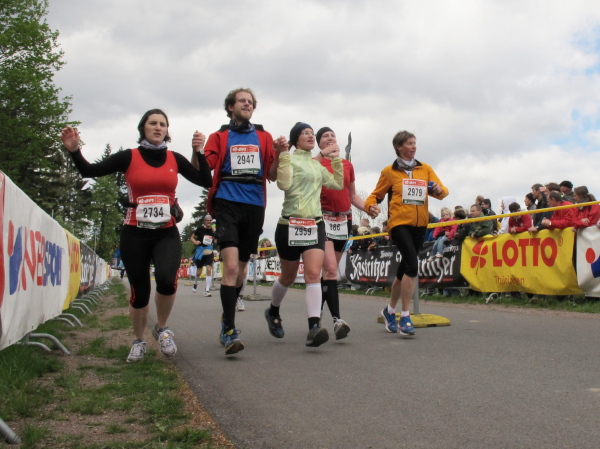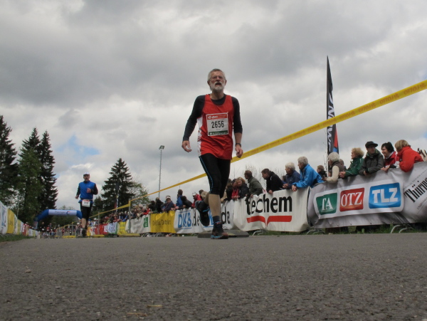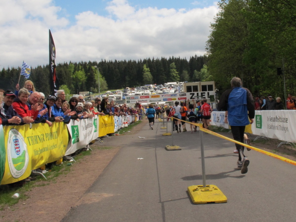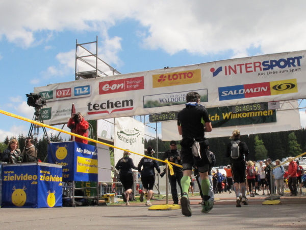 Dann die letzte Prüfung, der Anstieg zum Sportplatz. Zunächst sind kaum Zuschauer da. Man geht, sammelt Kräfte. Es wird lauter, man wird angefeuert, trabt wieder an. „Auf geht’s!“ „Nicht hängen lassen“, „Gleich seid Ihr da!“ schallt es uns entgegen. Noch einmal Höchstpuls und Gänsehaut wie beim Start vor etlichen Stunden, der Lärm aus tausend Kehlen, das Sportfeld, das eher einer Festivalwiese gleicht, Rauch und Bratwurstduft aus Grillstationen, dann erst das unscheinbare Zielbanner, hinter dem die mit Caravans lückenlos belegte Parkwiese von weitem wie ein Blechhaufen ausschaut - das ist das schönste Ziel der Welt, Schmiedefeld.