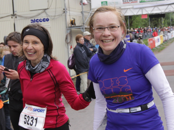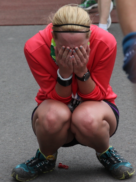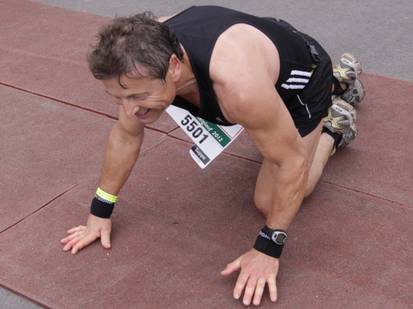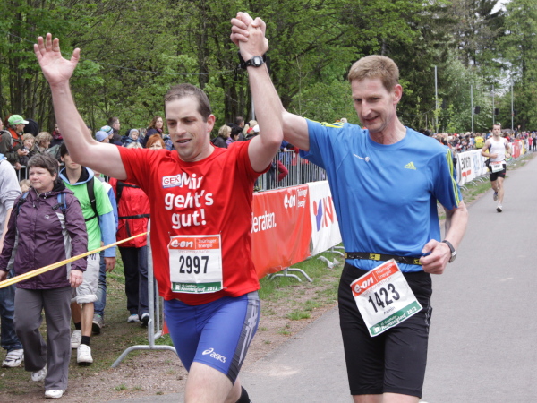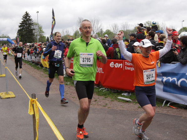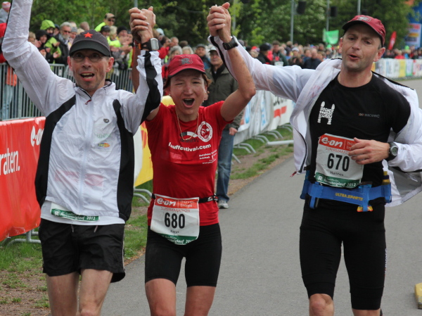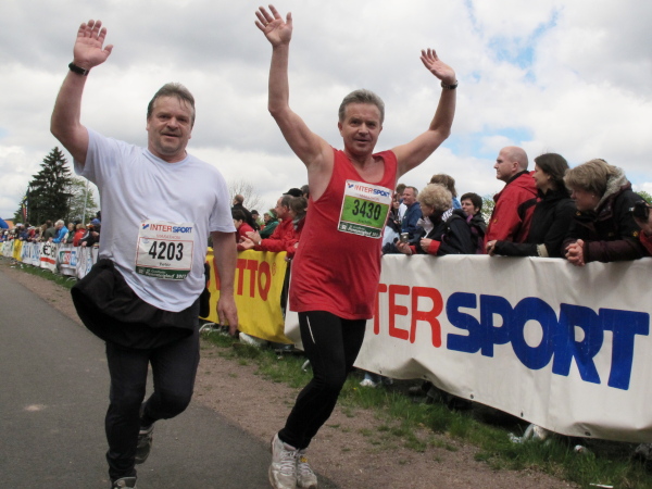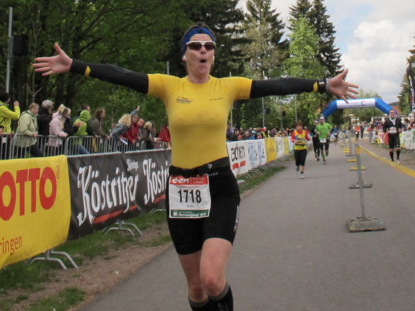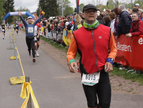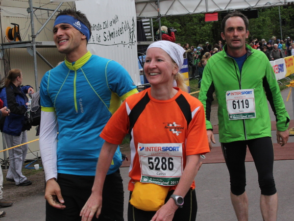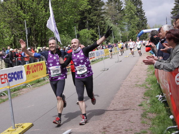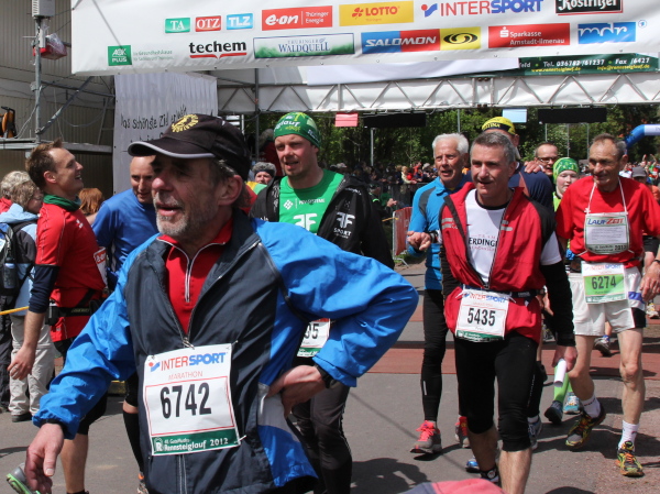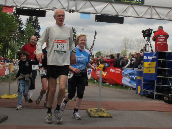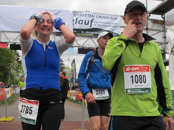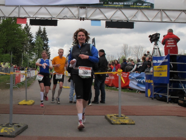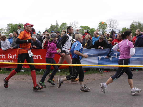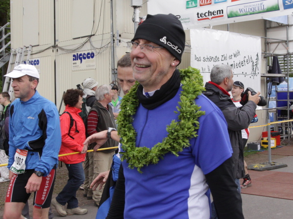 Dann die letzte Prüfung, der Anstieg zum Sportplatz. Zunächst sind kaum Zuschauer da. Man geht, sammelt Kräfte. Es wird lauter, man wird angefeuert, trabt wieder an. „Auf geht’s!“ „Nicht hängen lassen“, „Gleich seid Ihr da!“ schallt es uns entgegen. Noch einmal Höchstpuls und Gänsehaut wie beim Start vor etlichen Stunden, der Lärm aus tausend Kehlen, das Sportfeld, das eher einer Festivalwiese gleicht, Rauch und Bratwurstduft aus Grillstationen, dann erst das unscheinbare Zielbanner, hinter dem die mit Caravans lückenlos belegte Parkwiese von weitem wie ein Blechhaufen ausschaut - das ist das schönste Ziel der Welt, Schmiedefeld.