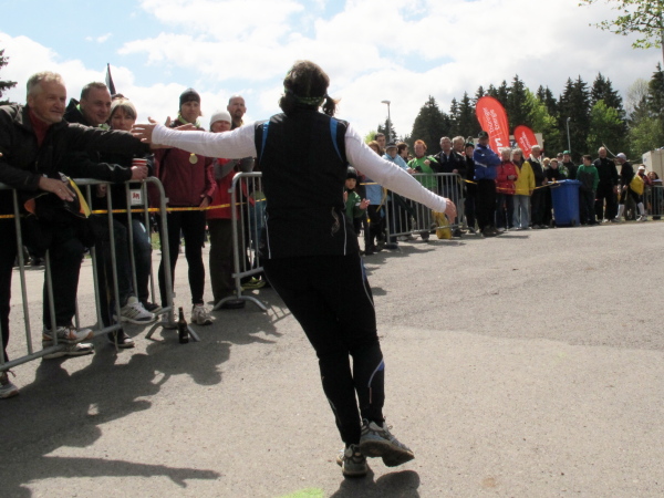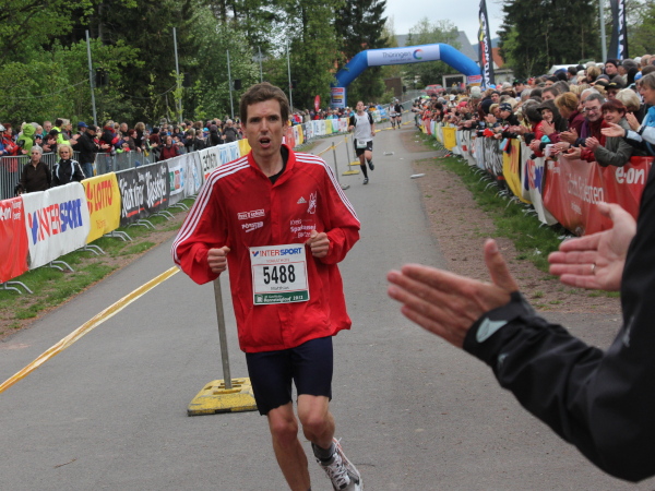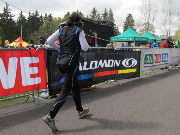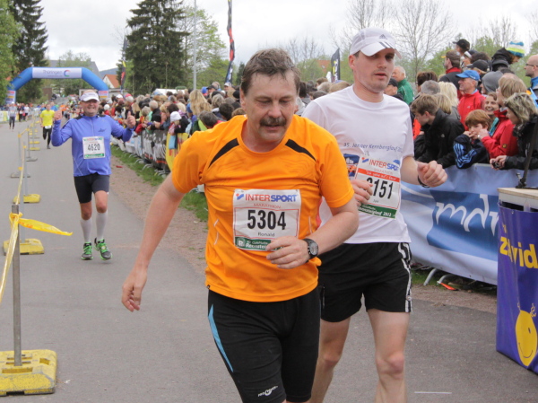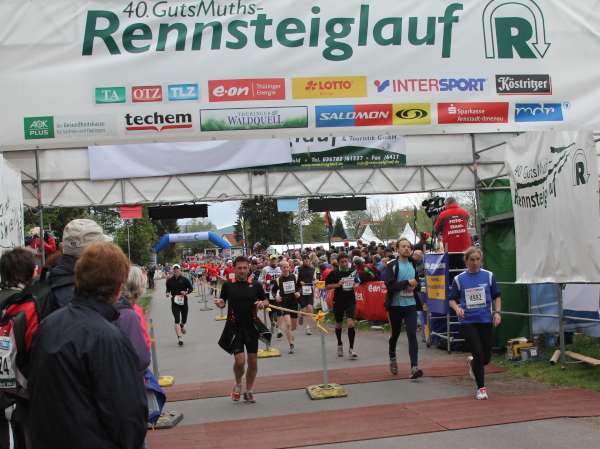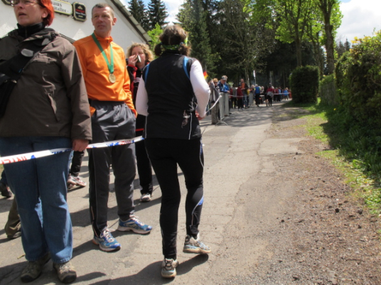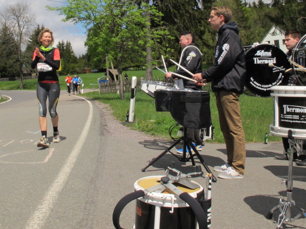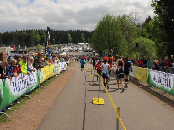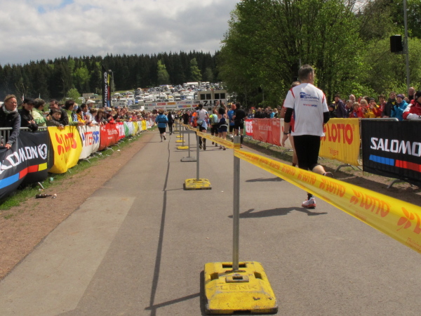 Ein Stück laufen wir parallel zur Verkehrsstraße nach Schmiedefeld, dann nimmt der Rennsteig zum Glück eine Abkürzung. Der Ort liegt unten im Tal, das Ziel auf dem Sportplatz auf der Anhöhe uns gegenüber, Luflinie 1000 Meter oder weniger. Fast kann man jedes Wort der Sprecher hören. Auf der Verkehrsstraße erreichen wir Schmiedefeld, den tiefsten Punkt der Strecke. Auf den Straßen dichter An- und Abreiseverkehr, Zuschauer, Läufer, Polizei und Ordner. Geordnetes Chaos.