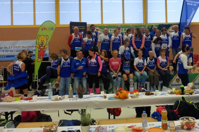 Die Straße führt über ein Gestüt in den Wald. Immer bergab. Merkt man bloß nichts von. Zwischendurch nämlich kommen sanfte Anstiege, die uns Nachzügler schön ausbremsen. Aber dann kommt km 35. Freies Feld. Blick auf Hachenburg und den VP von km 5. Das Team hat Verstärkung: der rosa Zwerg übt fleißig, uns mit zu versorgen. Klasse, dieser Nachwuchs hat echte Zukunft!