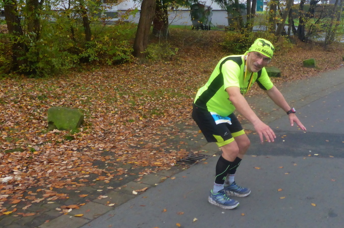 Samstag, der 21.10. Start des Mara um 11:30. Eigentlich ja Zeit genug für Anfahrt, Orga und alles weitere. Aber wie ich auf den Parkplatz einbiege, höre ich den Startschuss. Wer zu spät kommt, ...Solls das schon gewesen sein? Also wacker mal aufgerödelt, Regensachen an, zum Start geflitzt. Ja, ich könnte hinterher, aber erst die Startnummer holen in der 400m entfernten Sporthalle. Weitergeflitzt, die Orga aufgemischt, meine Nummer ausgegraben (es war schon alles weggeräumt), Danke an die fleißigen und verständnisvollen Helfer gesagt und zurück zum Start. Mit 27 Minuten Verspätung geht‘s los. Mitten durch das Bambinigewimmel.