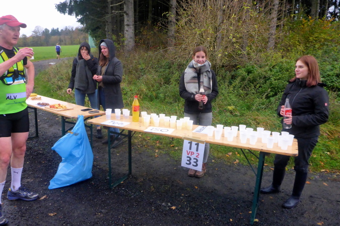 Die schön geschotterten Wege sind weitgehend trocken, führen über Wiese und Wald langsam hoch zum Sendemast und den Windrädern. Die drehen fleißig in Tief Elmars Wind und erzeugen dabei gehörig Krach. Das auf- und abschwellende Brummen begleitet mich eine ganze Weile. Eine Schleife über Straßen um den Sendemast herum führt zu VP2. Alles noch da. Kurze Stärkung und weiter. Wiese mit Aussicht, Wald mit knöcheltiefen Buchenblättern. Es ist einfach eine Freude hier. Kaum habe ich km 14 passiert, kommt mir der künftige Sieger entgegen. Hochkonzentriert. Zwei Radler als Begleitschutz. Und weg sind sie.