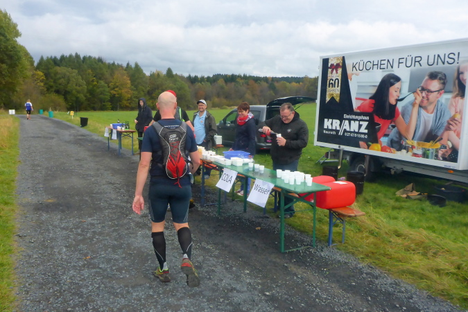 Ich beschließe wie immer, das Feld von hinten aufzurollen. Nur so für die Motivation. Noch nie war ich soo weit hintendran. Auf schönen Waldwegen geht es dahin. Die Beschilderung ist vorbildlich, jeder km ist nummeriert. Die Halbmaras kommen schließlich nachher auch noch hier durch. Hier oben ist es schön wellig, führt aber immer weiter aufwärts. Der erste VP ist verwundert, versorgt mich aber bestens und auch den Buschfunk: Einer kommt noch.