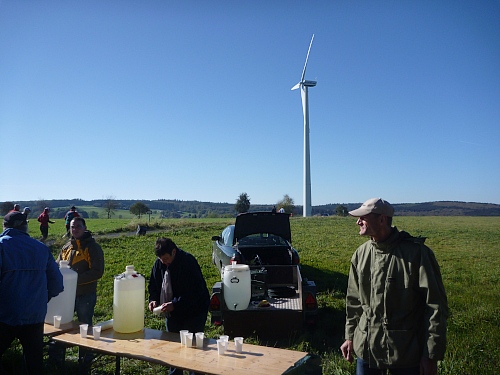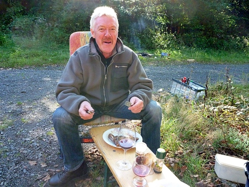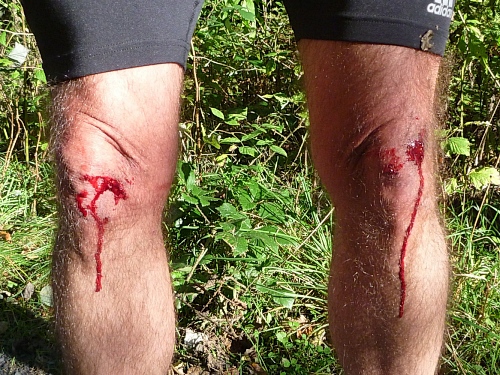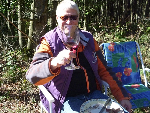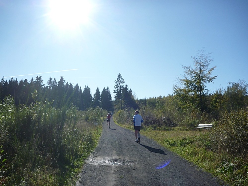Hier ist die Alpenroder Hütte, Bikertreff und Reiterziel. Hachenburger Pils sei Dank. Von nun an geht es bergab. Jörg, der Halbmarathonläufer, macht den gesprungenen Rittberger und wir suchen seine Brille im Bereich seiner Landebahn. Er sieht eh nix mehr und ist halb verblutet.