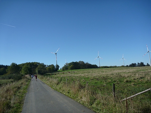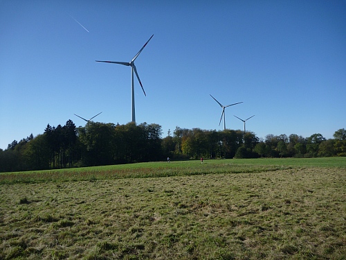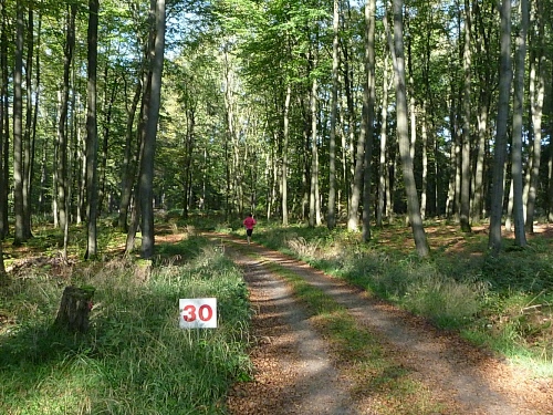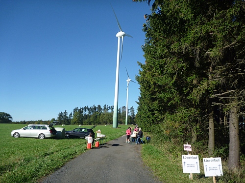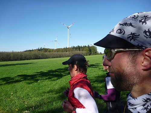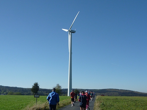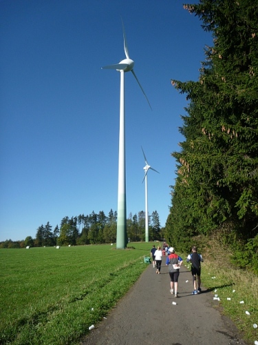 Bei Km 13 der „große Weißenstein“, das war alles nicht so schlimm, und soviel lachende Läufer habe ich selten gesehen. Lochumer Heide, der Ort Gehlert rechter Hand wird nicht durchquert. Es ist wie TeleTubbieLand, quitschgrüne Wiesen mit hohen Windmühlen und laufenden Stofftierchen in bunten Farben. Ich habe sowas auf meinen Läufen noch nie erlebt: Wir strahlen uns gegenseitig an und zitieren Luise Koschinsky.