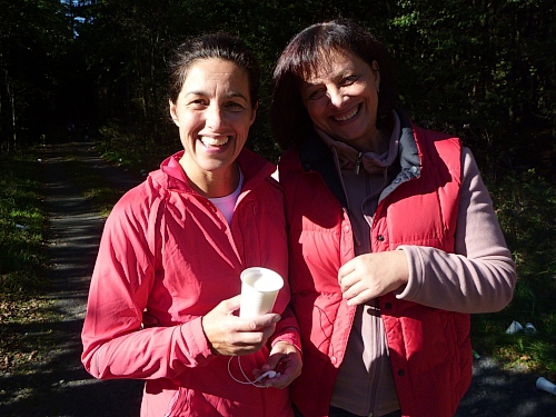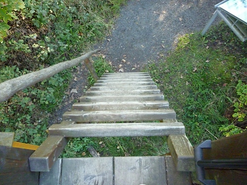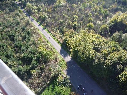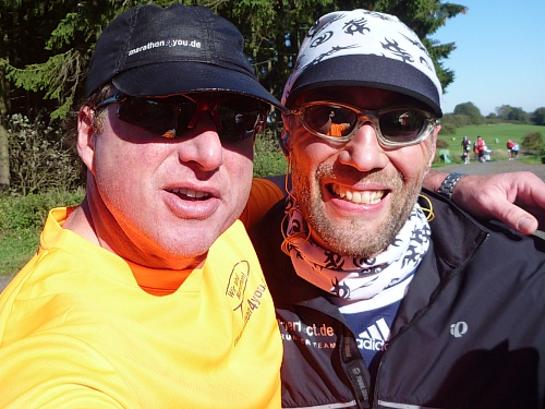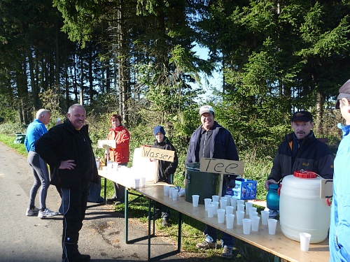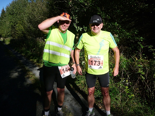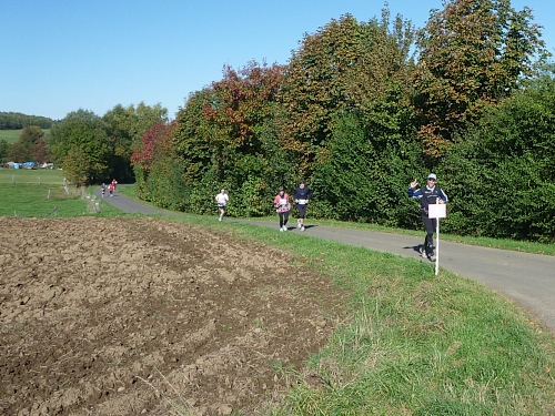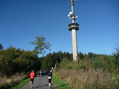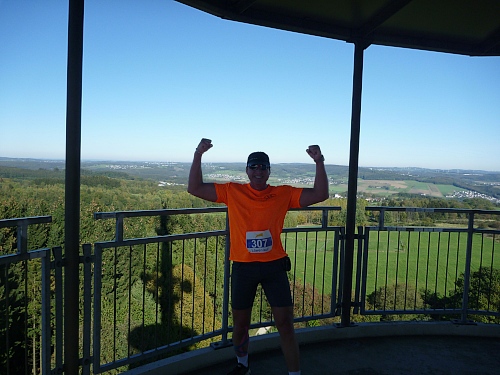 Bei km 33 höchster Punkt der Strecke. Der Gräbersberg. Voll bescheuert, aber in 25 Jahren ist nie ein Läufer die 167 Stufen zur Aussichtsplattform hochgelaufen. Wie blöd! Ich finde, das gehört einfach dazu. Denn der Blick zur Eifel mit den Vulkankegeln, dem Siebengebirge und dem Großen Feldberg im Taunus ist der absolute Hit. Ich stehe oben auf der Plattform und brülle den Läufern unter mir Zitate von Luise Koschinsky zu. Das ist voll bescheuert, macht aber Spass!