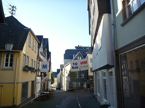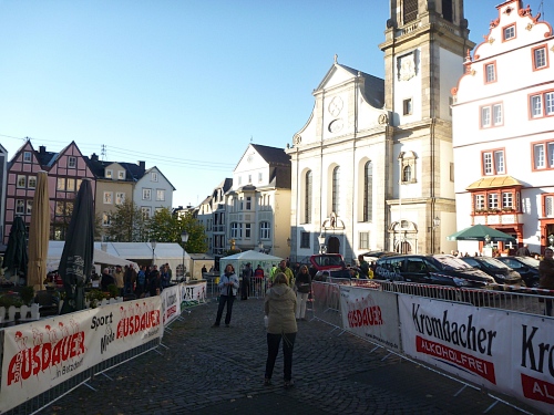 Der Zieleinlauf am Alten Markt ist klasse. Wunderbar. Das „Steinerne Haus“, heute das Hotel zur Krone. Da kann man schön in der Sonne sein Zielbier geniessen. Auf dem Dachfirst ein „Mohrenkopf“, der das Haus als Gästehaus ausweist. Dieser Brauch entstand durch die Kreuzzüge.