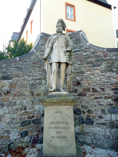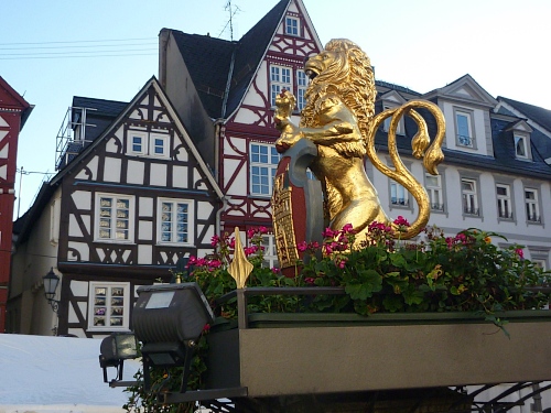 Der Löwe fand seinen Platz 1884 auf dem Brunnen, als Kaiser Wilhelm I dem Grafen Alexander den Titel „Graf von Hachenburg, Prinz zu Sayn-Wittgenstein“ verlieh. Der Löwe als Wappentier stammt von Graf Johann I (13.Jahrh) der den Beinamen „der saynische Löwe“ trug.