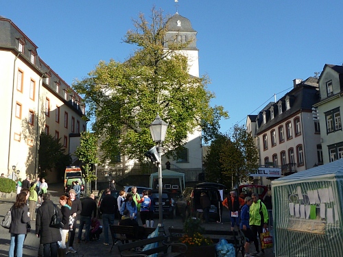 Hier auf dem Markt wurde 1766 mit dem Schwert die letzte Hinrichtung an einer Mörderin vollstreckt. Den Schriften nach war das ein riesiges Volksfest, so wie heute der Löwenlauf, nur jetzt sind wir halt die Delinquenten. Auf dem Markt befand sich natürlich auch der Pranger, aber viel interessanter war der sogenannte Triller, ein trommelartiges, drehbares Gehäuse, in das die Delinquenten eingesperrt wurden. Jeder der vorbeikam, durfte dann nach Belieben an dem Ding drehen. Ganz witzige Einrichtung. Ich glaube, Sabine hatte sonntags so einen Flashback an diese Zeit.