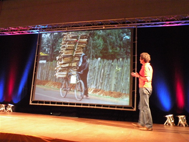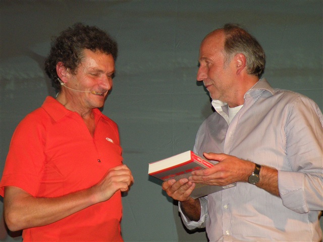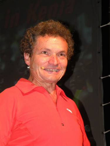 Am Vorabend düsen Elke und ich zum ersten Mal nach Hachenburg, denn der Veranstalter hat Herbert Steffny, seines Zeichens Marathon-EM-Bronzemedaillengewinner 1986, dreifacher Frankfurt-Marathon-Sieger, 16-facher Deutschen Meister über 10 000 Meter, 25 Kilometer, Marathon, Berg- und Crosslauf, Diplom-Biologe, Trainer, TV-Laufexperte, Sportjournalist und Autor zahlreicher Standardwerke der Laufszene zu einem Multimedia-Vortrag zum Thema: "Bei den Wunderläufern im Hochland von Kenia und was wir davon lernen können" verpflichtet. Herbert hatte schon in den 1980er-Jahren als einer der ersten Weißen in Kenia trainiert und führt uns ins Hochland von Kenia zu den wahren Wurzeln des afrikanischen Laufwunders. Er referiert in seinem motivierenden Sportreisebericht über das (angebliche) kenianische Laufwunder, die Evolution des Laufens (im Rift Valley lernte der Mensch das Laufen), über Historie und Statistiken zu Kenia, der laufenden Übermacht, zu seinen Erlebnissen als Gast im Hochland bei den Kalenjin, zur Fitness als Notwendigkeit, zur Ernährung der Läufer (Wunderwurzeln?), der dünnen Hochlandluft (Höhentraining) und erklärt abschließend, warum der weiße Mann hinterherläuft. Klasse, gerade den letzten Punkt kann ich morgen prima als Argumentationshilfe für mein Abschneiden gebrauchen. Meine von ihm signierte Startnummer ist der krönende Abschluß seines Vortrags.