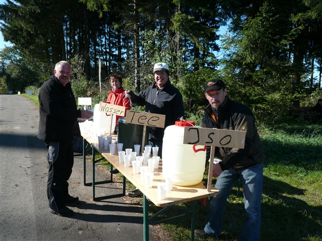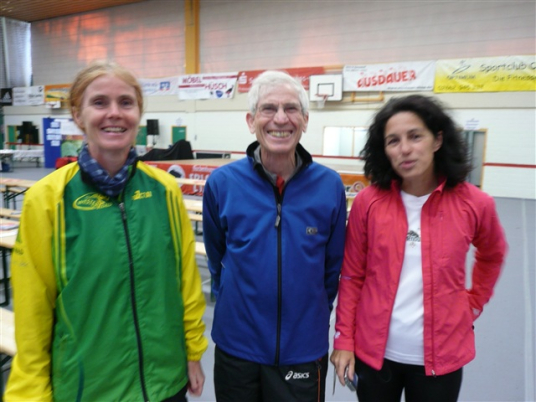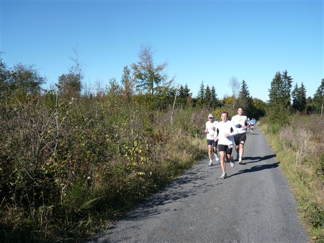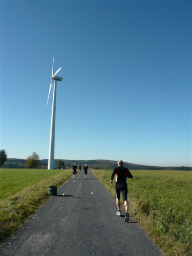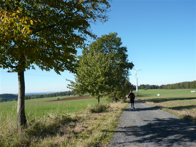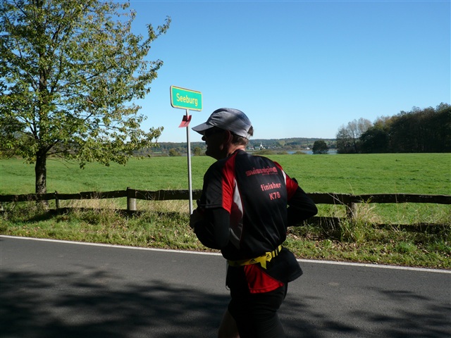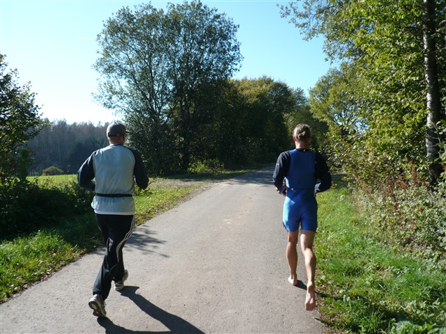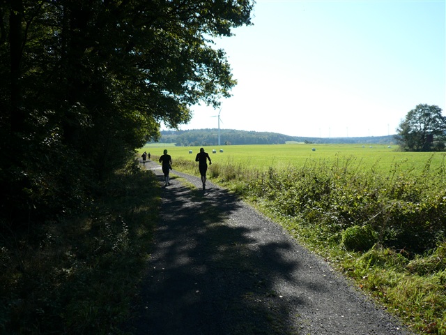 Weit voraus bewegt sich, für mich unerreichbar, ein bewunderungswürdiges Phänomen. Obwohl ihm die Bezeichnung eigentlich nicht gerecht wird, denn das klingt nach Zufall und bekanntermaßen kommt nichts von alleine. Der im südlich der Seenplatte gelegenen Weidenhahn wohnende Norbert Hoffmann, spätberufener Läufer und Senior der 3 Generationen Hoffmann (Opa, Mama, Enkelsohn), ist aktueller Weltmeister der AK M70 im 100 km-Lauf (9:49!!!), errungen in Winschoten. Und läuft mich als 20 Jahre Älterer problemlos in Grund und Boden, dreieinhalb Stunden über flache 42 km sind für ihn durchaus noch Normalmaß. Und das beleibe nicht nur ein Mal im Jahr, der Mann ist die Hölle! Mama Sigrid, Vierte ihrer AK in Winschoten (ebenfalls in 9:49 Std.) steht ihm kaum noch nach (aktuelle Westdeutsche Marathonvizemeisterin in 3:30:55 letzte Woche am Baldeneysee und heute schon wieder „zum Auslaufen“ unterwegs) und ihr Sohn Hans ist auf dem besten Wege, ebenfalls mal Marathonläufer zu werden. Vorletzte Woche noch haben sie als Staffel „3genHoffmann“ Waldbreitbach unsicher gemacht.