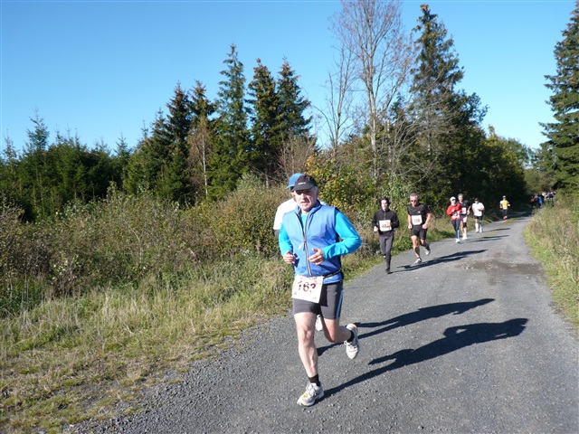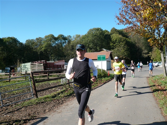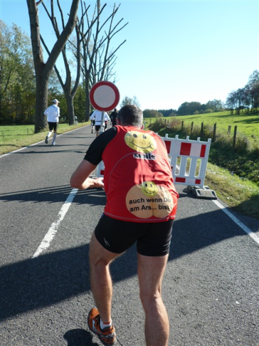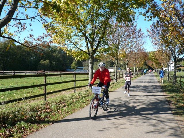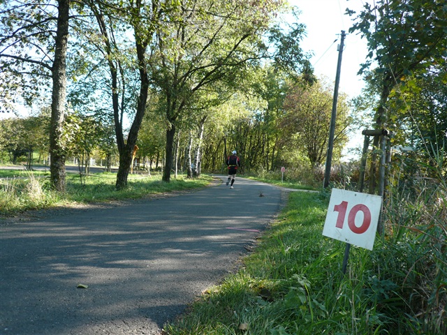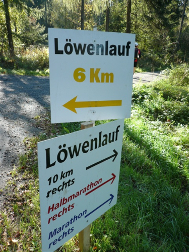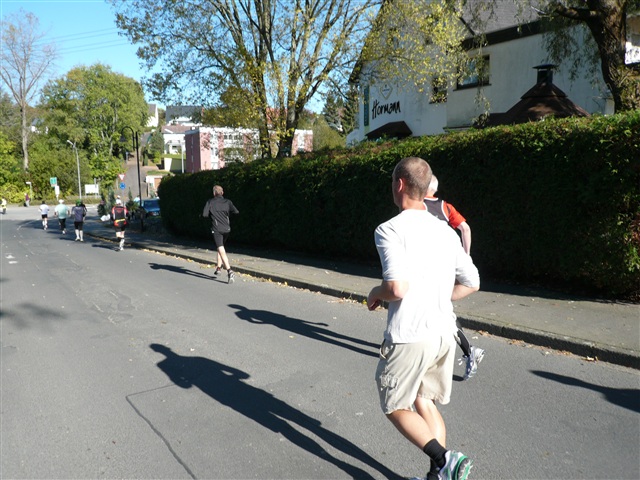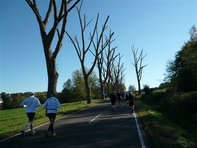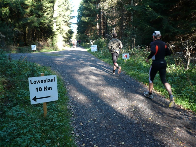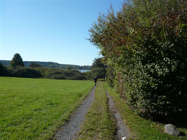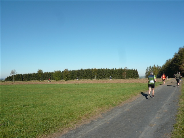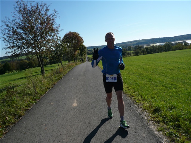 Danach gilt es im weiteren Verlauf, wieder an Höhe zu gewinnen. Wobei bis auf die flache Seerunde eigentlich ständige Wechsel zwischen Auf und Ab stattfinden. So kommen natürlich doch etliche Höhenmeter, insgesamt 455, zusammen, wobei die Einzelsteigungen völlig harmlos sind. Natürlich nur dann, wenn Du etwas drauf hast. Ab gut der Hälfte laufe ich den Rest mit Stefan aus dem Bergischen zusammen, wir haben uns viel von vergangenen und zukünftigen Heldentaten zu erzählen und so ist der weitere Verlauf äußerst kurzweilig und lenkt vom völlig fehlenden Zuschauerzuspruch unterwegs ab. Danke, Stefan, und alles Gute beim Röntgenlauf!