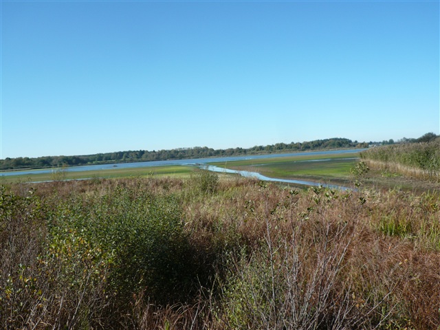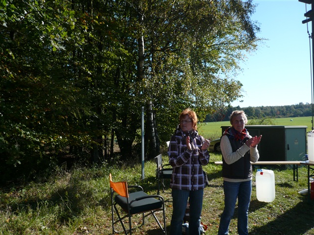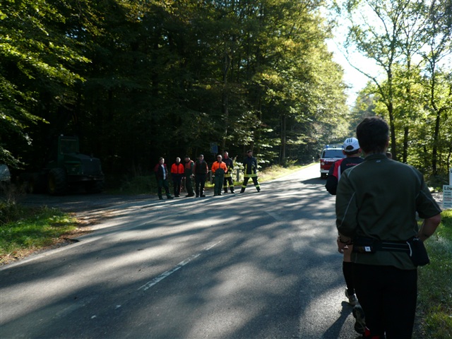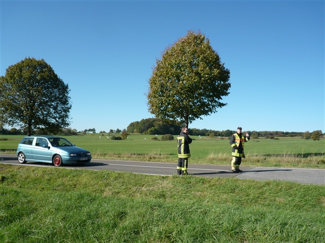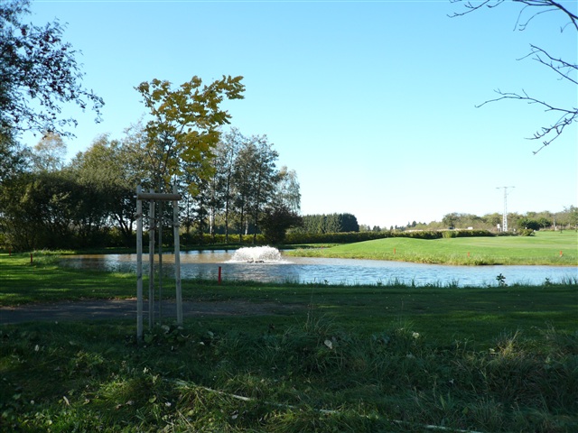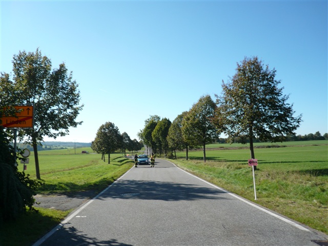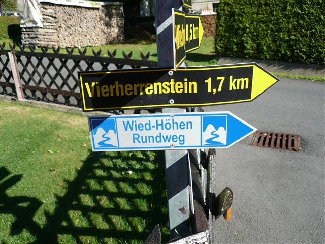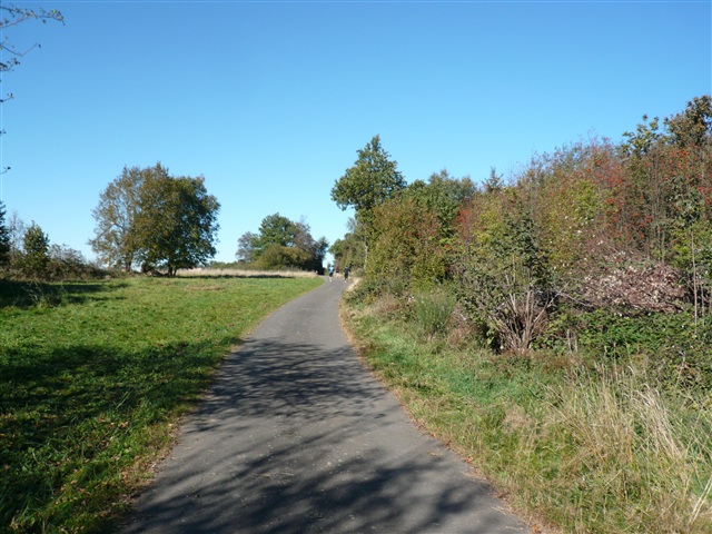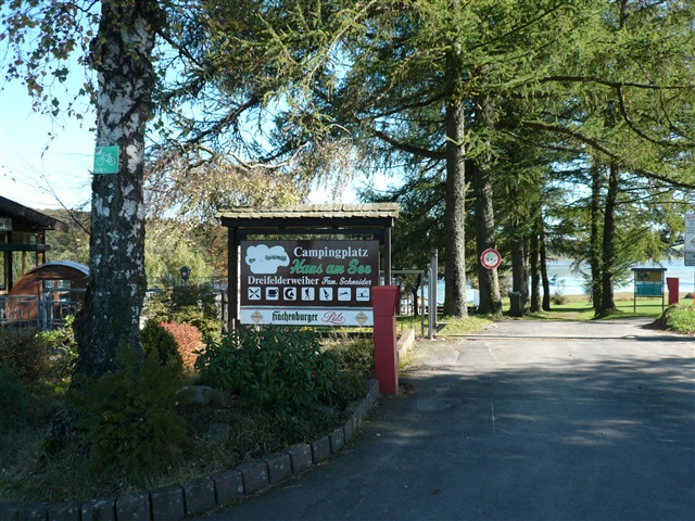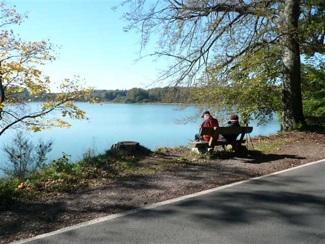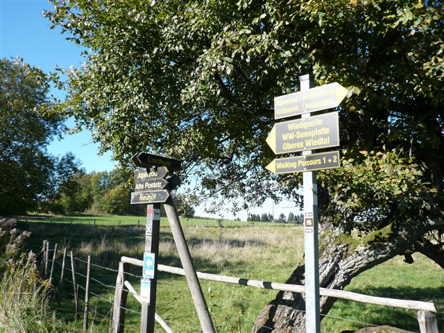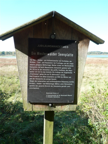 Die nächsten 4 km sind beinahe flach, ideal zum Erholen. Vorbei am Golfplatz geht es weiter, die gleichnamige Ortschaft umrundend, an den (zur Zeit trockengelegten) Dreifelder (oder auch See-)Weiher, dem mit 123 ha Fläche größten See der Westerwälder Seenplatte. Nach dem Dreißigjährigen Krieg wurde u. a. er künstlich zur Fischzucht angelegt und wird im Übrigen von der Wied durchflossen. Ja, was dem Rhein im Bodensee recht ist... Die wenigen Straßenüberquerungen sind vorbildlich durch die Feuerwehrkameraden gesichert. Die, wenn wir nicht hätten!