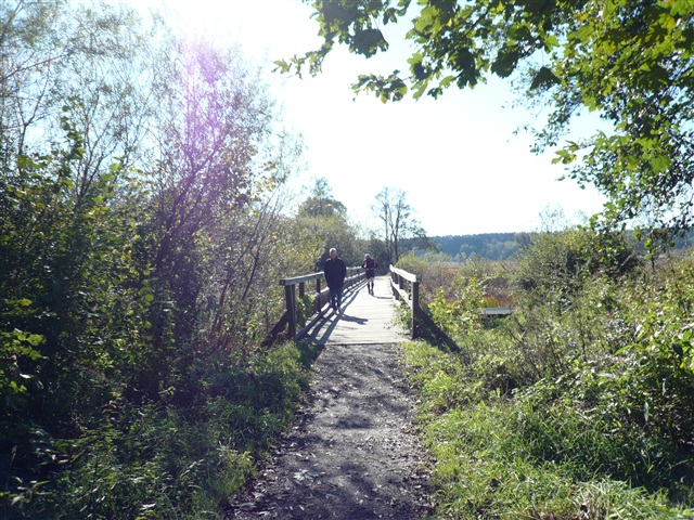 Wir umrunden den Dreifelder Weiher großräumig und haben an seiner Südspitze auch den südlichsten Punkt der Strecke erreicht. Dieser Abschnitt ist für mich der attraktivste des gesamten Laufs. Unbefestigte Naturwege führen durch lichten Wald, Wurzelpurzelwege sind zu nehmen und verlangen meine ganze Aufmerksamkeit. Dabei sind einige kleine Brückelchen zu überqueren, klasse. Ich weiß nicht, ob das eine Frage des zunehmenden Alters ist, aber ich kann Landschaftsläufen immer mehr abgewinnen. Der Weg verläuft weiter am Haiden- und Hoffmannsweiher; die Höhenlage der Seenplatte bewegt sich übrigens zwischen 400 und 420 m. Nördlich von Dreifelden haben wir einen 10 km langen, beinahe ebenen, kompletten Kreis geschlagen und befinden uns ab sofort auf dem Rückweg in Richtung Norden.