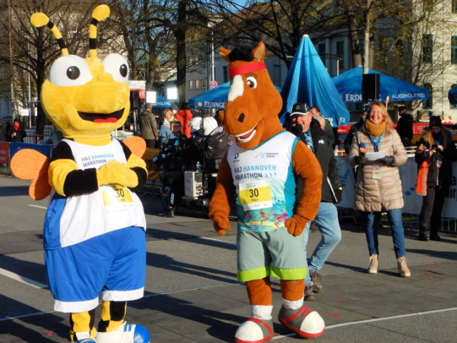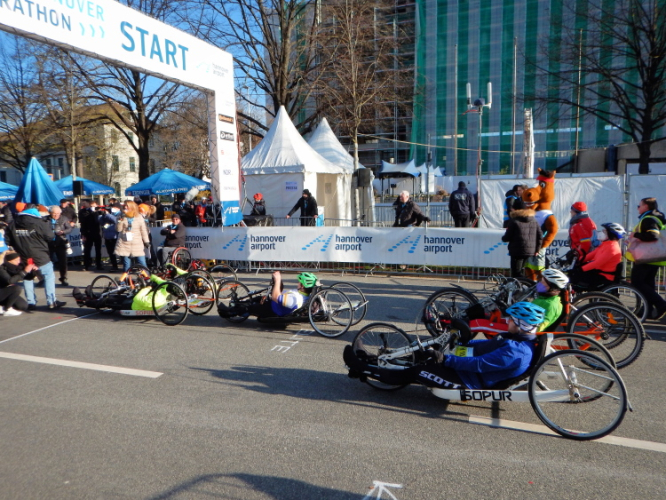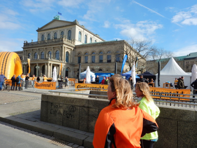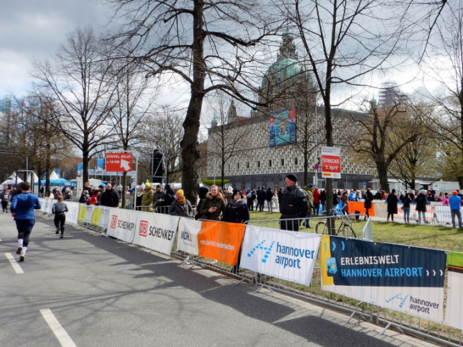Was ich bisher von Hannover wusste? Ich gebe es zu: Herzlich wenig. Die Berichte von Mario machten - auch nach Abzug der vermuteten Voreingenommenheit eines Eingeborenen, die ich ihm unterstelle – Lust darauf, endlich mehr davon als nur die Autobahnschilder auf dem Weg nach Lappland kennenzulernen. Deshalb stehe ich wieder am Trammplatz und dem Neuen Rathaus. Gestern habe ich hier die Starunterlagen abgeholt, jetzt suche ich den Zugang zu meinem Startblock. Also, nicht dem, der auf meiner Startnummer aufgedruckt ist; ich will für niemanden ein Hindernis sein und reihe mich dort ein, wo es kein Gedränge gibt und meine momentane Leistungsfähigkeit – oder eben -unfähigkeit – nicht auffällt. Das gibt mir die Möglichkeit, vom Start der Handbiker, der Elite und allen anderen Schnellen Fotos zu machen.