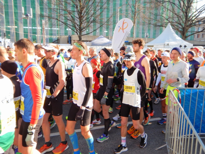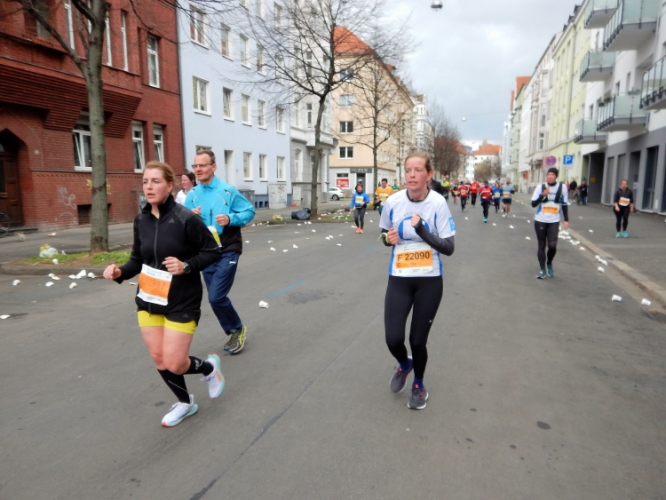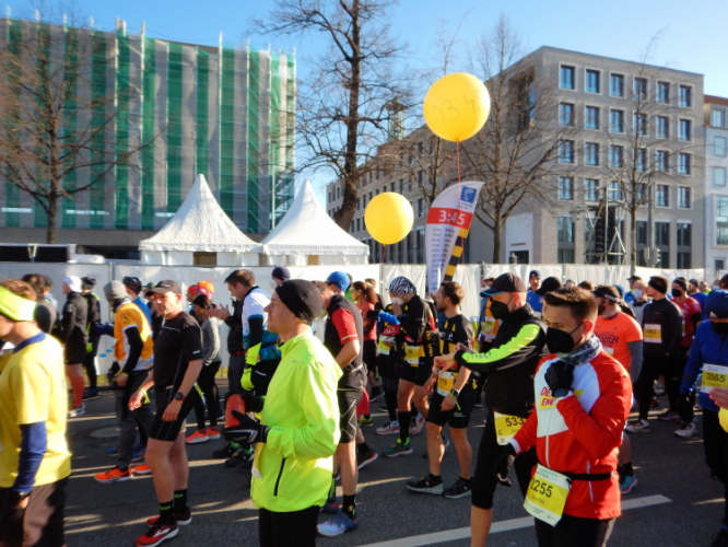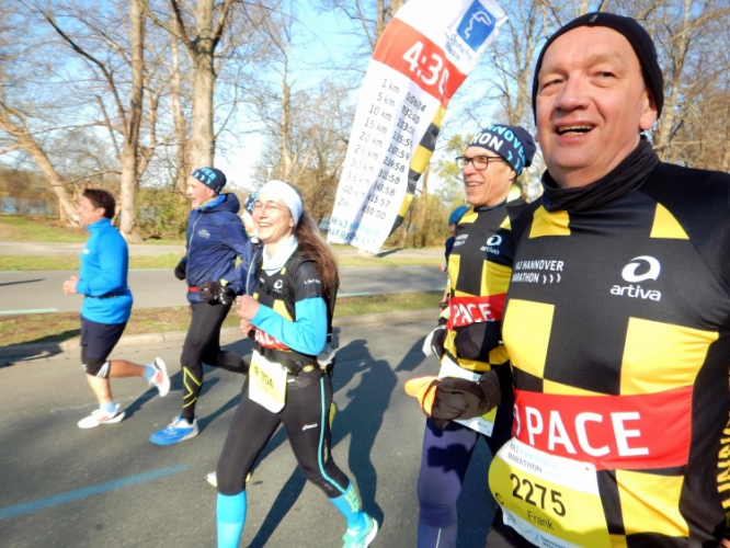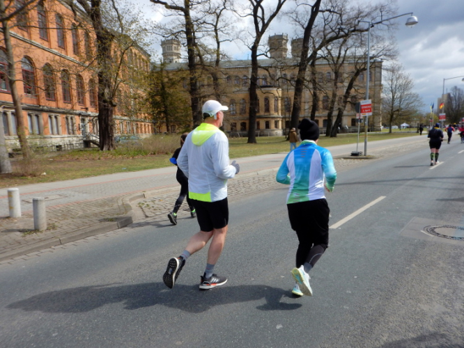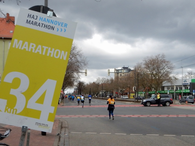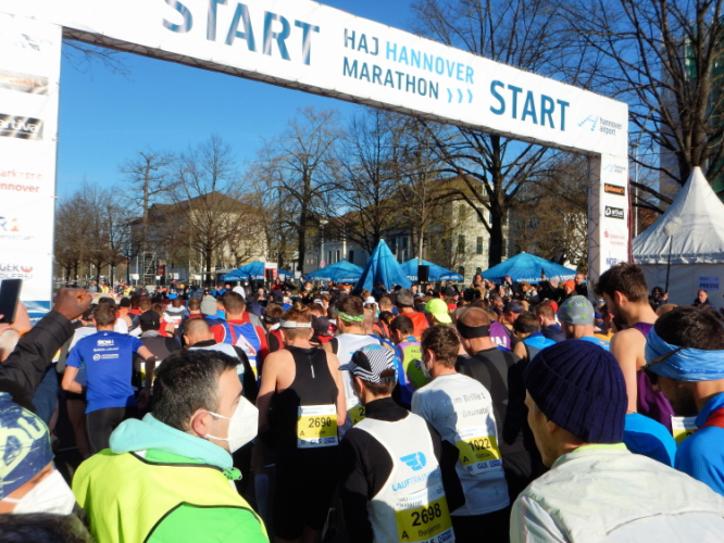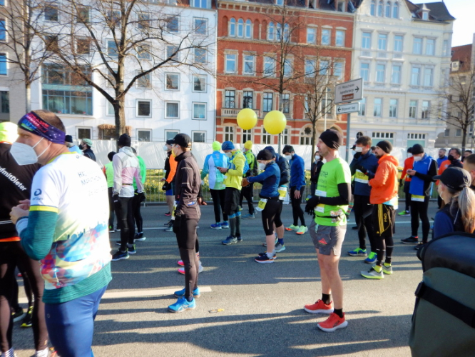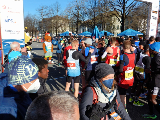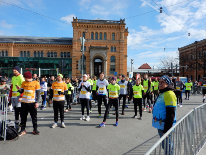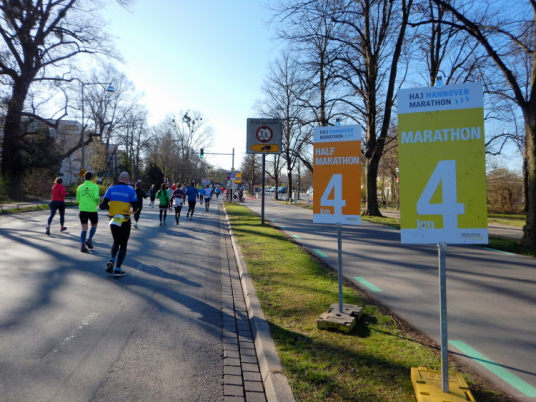 Gestern habe ich gleich nach der Startlinie auf der linken Seite der Leine entlang einen nach Clara Zetkin benannten Weg gesehen. Spontan kam mir der Wintermarathon in Leipzig im gleichnamigen Park in den Sinn, wo mehrere Reporter von uns in Teams mitliefen und meine Marathonstatistik dreistellig wurde. Das ist schon eine Weile her und ich habe nicht mehr den Drang und die Verfassung, auf schnelle Zeiten zu laufen. Gemütlich mache ich mich auf den ersten Kilometer, doch ich spüre, dass ich mit- und nach vorne gezogen werde. Ein Stadtmarathon dieser Größe hat den Vorteil und birgt gleichzeitig die Gefahr, diesen zusätzlichen Schub bieten zu können.
