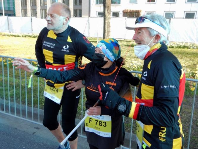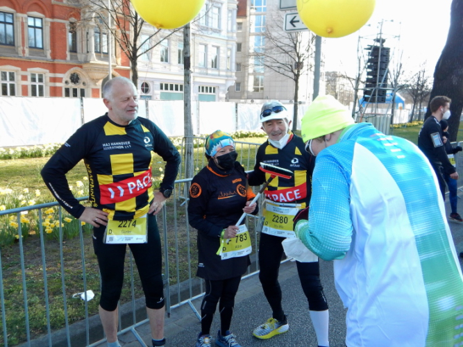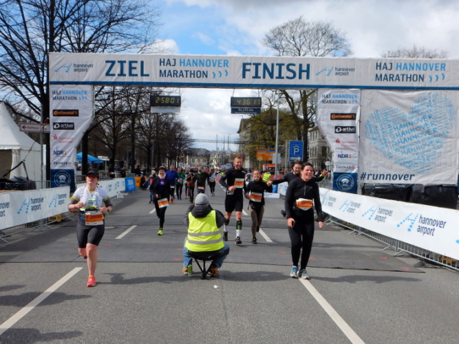 Der Marathonkreis durch die Stadt Hannover schliesst sich ebenfalls unmittelbar. In entgegengesetzter Seite zum Start bin ich im «short final» auf den Zielbogen zu. Nach der Überquerung der Zeitmessmatten nehme ich mir Zeit und beobachte die eintreffenden Mitstreiter. Die Gesichter sprechen Bände. Es fliessen Tränen, es ertönen Freudenschreie. Das Warten über die Jahre war anstrengend, umso grösser die Freude, endlich wieder von der Leine gelassen worden zu sein und an der Leine Marathon-Normalität leben zu können.