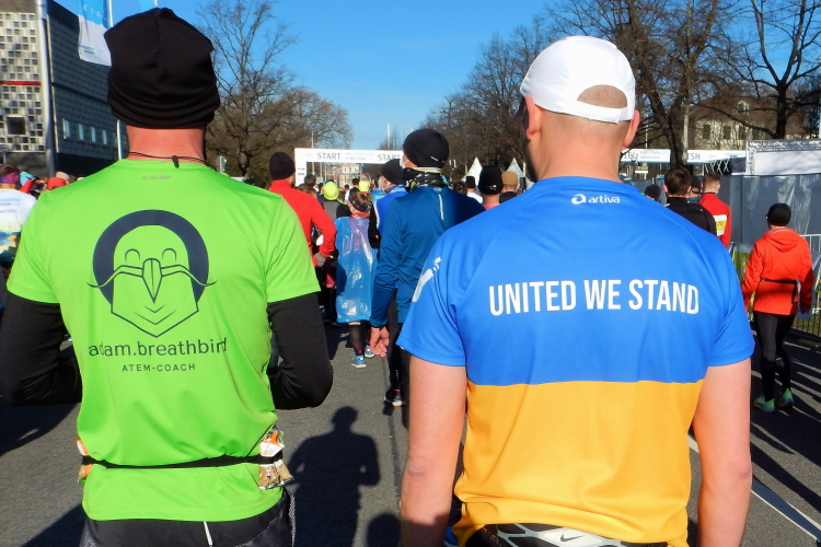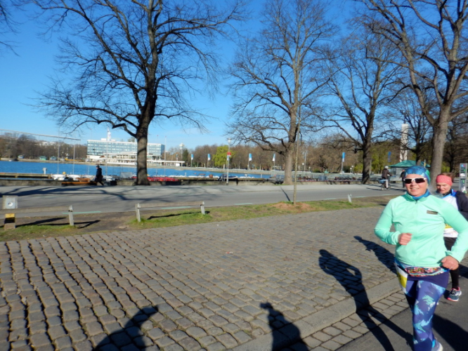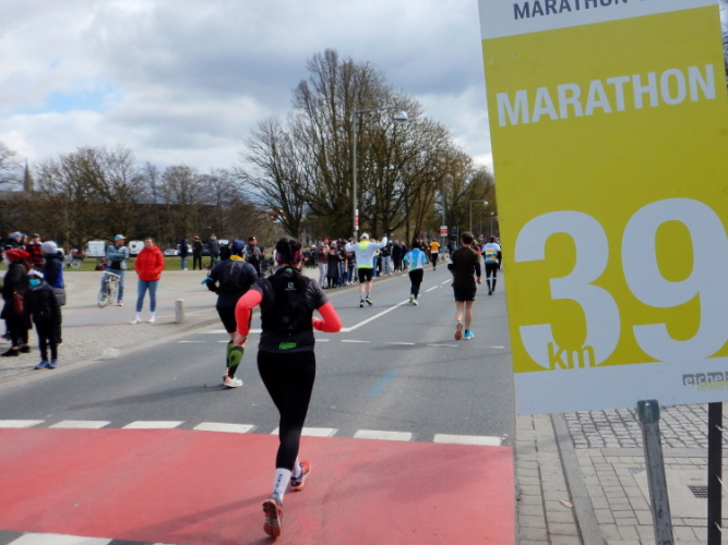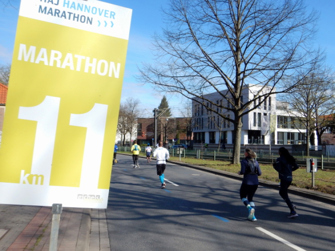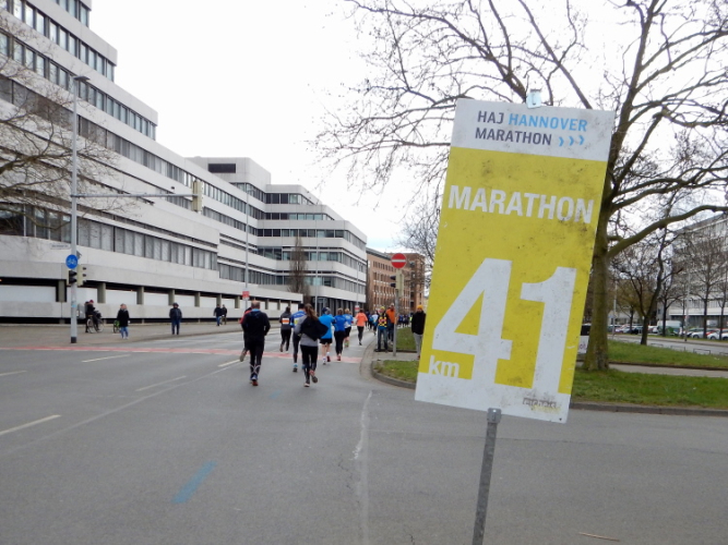 Ein Schlenker nach rechts, einer nach links, und schon liegt eine lange Gerade vor mir. Von der Hochschule für Musik, Theater und Medien an gibt es auf einem Kilometer eine Begegnungsstrecke. Zu welcher Kategorie die Entgegenkommenden zählen dürfte klar sein, wenn ich erwähne, dass sie zehn Kilometer Vorsprung haben. Wobei zu erwähnen ist, dass diejenigen, mit denen ich vor ein paar Stunden beim Frühstück saß, schon außer Sichtweite sind. Dabei bin ich doch auch ganz flott unterwegs…