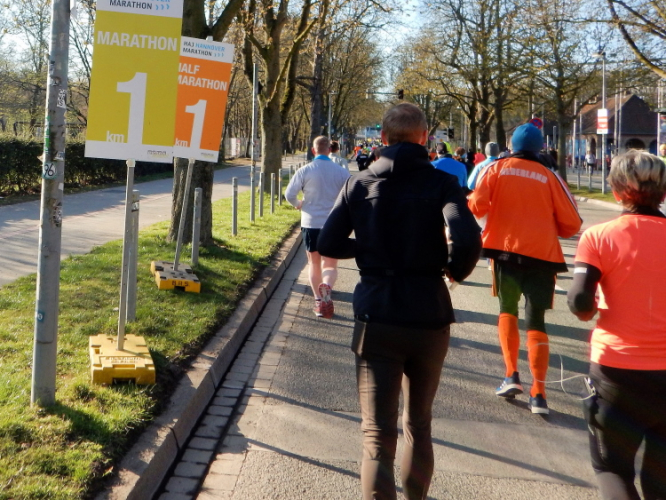 Für über fünf Kilometer sind wir, abgesehen von einer kleinen Abkürzung für die Halbmarathonis in der Nähe des Bahnhofs, gemeinsam unterwegs. Auf diesem Abschnitt ist in Sachen Zuschauer was los, womit die Kilometer nur so vorbeifliegen. Umso abrupter ist der Wechsel nach der Marathonweiche. Es kommt alles zusammen. Die Straße ist breit, das Feld ist auseinandergezogen, Zuschauer, welche für Anfeuerung sorgen, sind vergleichsweise Mangelware. Dazu kommt, dass sich der Himmel bedrohlich verdunkelt und ein heftiger werdender Wind um die Ohren bläst. Nun ist mentale Stärke gefragt. Nach Zeitmessmatte und Verpflegung bei Kilometerschild 35 laufen wir an einem Kleingartenverein mit dem sinnigen Namen Feierabend vorbei. Feierabend? Nicht jetzt, aufgeben wäre blöd und den kultigen Newtimer T3 Bulli-Pickup in Pink bekäme ich nicht zu Gesicht.