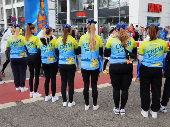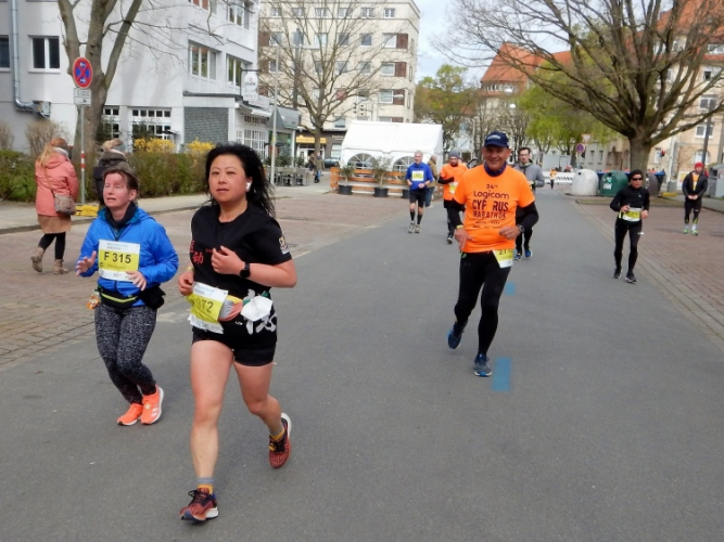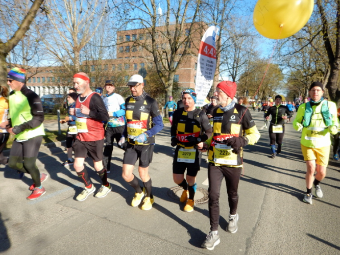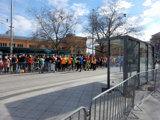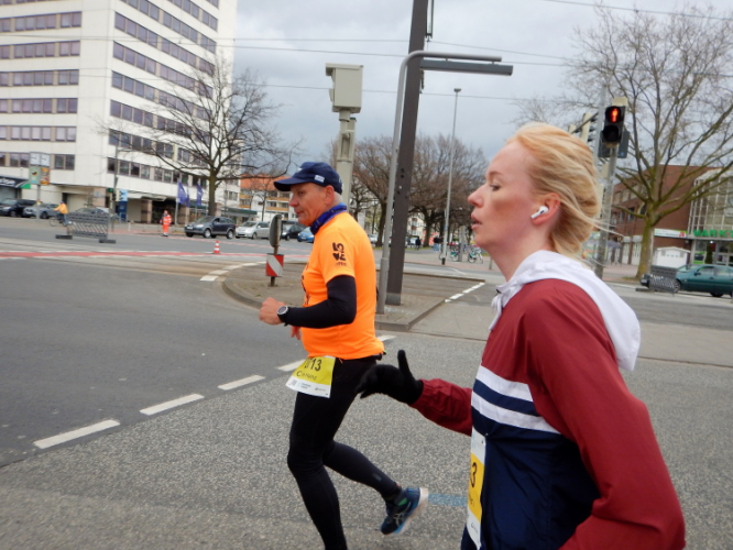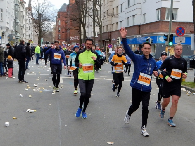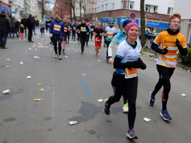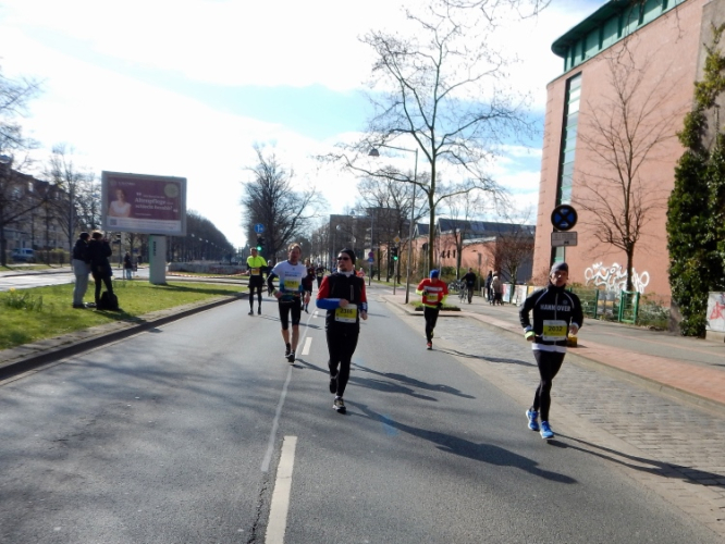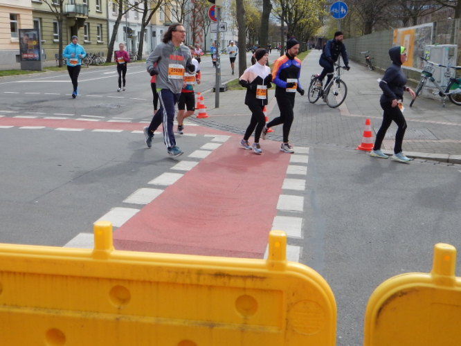 Nach der Begegnungsstrecke, auf welcher niemand mehr entgegenkommt, gibt es bei der Hochschule für Musik, Theater und Medien eine neue Begegnung. Unsere und die Strecke des Halbmarathons treffen hier aufeinander und mit der vergrößerten Anzahl Läufer auf der Strecke nimmt auch die Dynamik wieder zu. Keine Ahnung, in welchem Zeitbereich sich diese auf ihrer Distanz bewegen, Schub und Zug gibt es allemal.