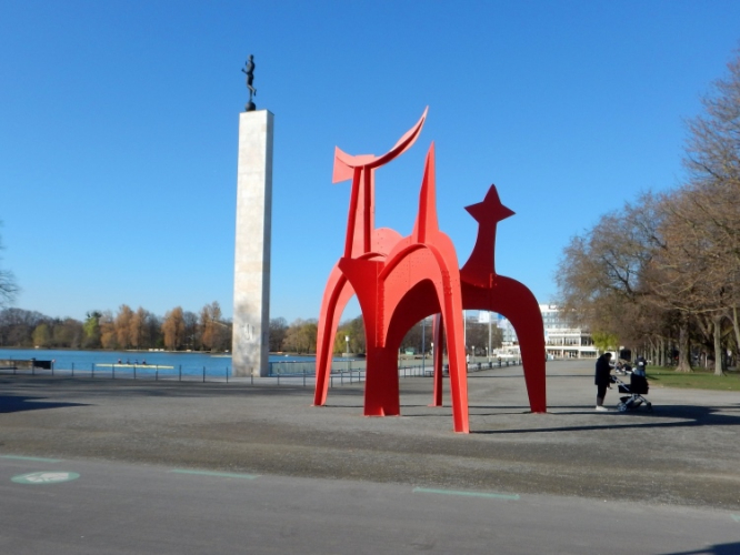 Beim Königsworther Platz führt eine Spitzkehre nochmals vom Ziel weg. Der Parkanlage entlang geht es auf eine kleine Schlaufe, die wieder über die Leine führt, dann ein zweites Mal, und weil aller guten Dinge drei sind, noch einmal. Damit ist auch das Leibnizufer erreicht und der «final approach», wie das beim Anflug auf den Flughafen HAJ, dem Titelsponsor des Hannover Marathons, heissen würde. Im Gegensatz zum Piloten kann ich mir in dieser Phase des Anflugs am Hohen Ufer noch einen genaueren Blick zur Seite erlauben und zu den begehrtesten Fotomotiven der Stadt werfen. Die drei Nanas der Künstlerin Niki de Saint Phalle, welche im Jahr 2000 zur Ehrenbürgerin der Stadt ernannt wurde, hatte sie durch ihre Heirat mit dem von mir bewunderten Eisenplastiker Jean Tinguely auch das Schweizer Bürgerrecht. Jean Tinguely selbst ist unweit von Bern, dem Geburtsort Hodlers, in Fribourg geboren und in Basel aufgewachsen, wo ich das Gymnasium besucht habe, womit der künstlerische Kreis zur Schweiz gewissermassen geschlossen ist.