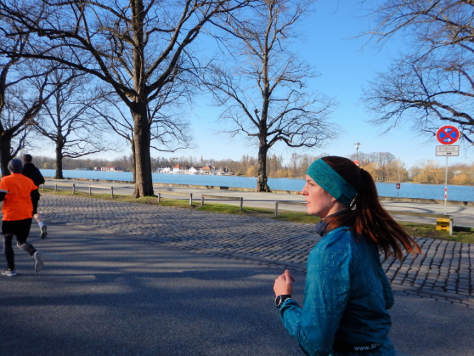 Die Sonne von vorne und rechts der Maschsee. Das fühlt sich wie Urlaub an. Dass das Buddeln des Sees von Hand seinerzeit von und für den Propagandanutzen der Partei geschehen ist, versuche ich ganz weit in den Hinterkopf zu verbannen. In Zeiten wie diesen brauche ich Tapetenwechsel. Der Himmel leistet seinen Beitrag dazu. Stundenlanges Schneetreiben auf der Hinfahrt die Nacht zuvor und nun die Sonne im Gesicht – der Kontrast könnte größer nicht sein. Einen Moment lang habe ich das Gefühl, vielleicht doch eine Schicht zu viel angezogen zu haben. Jetzt die Jacke ausziehen kommt nicht in Frage, denn ich bin so richtig im Flow. Wenn‘s läuft, dann läuft’s.