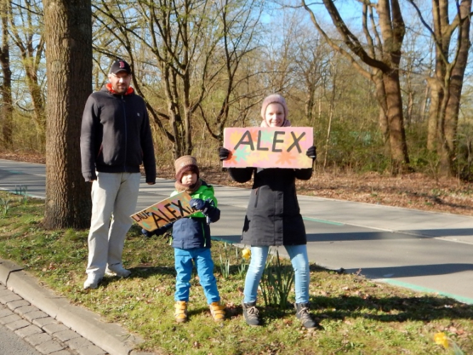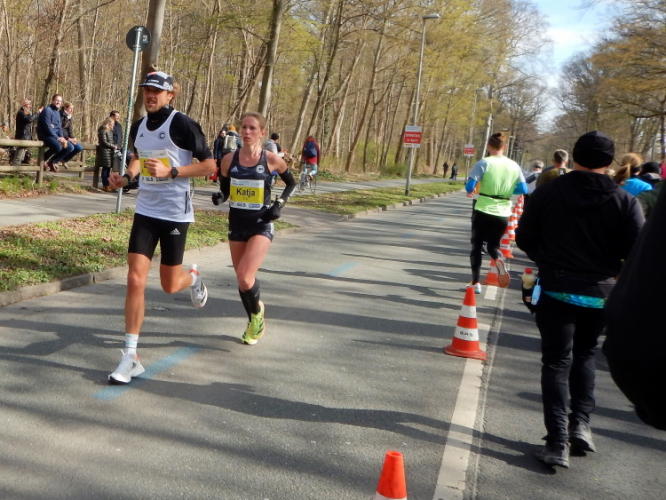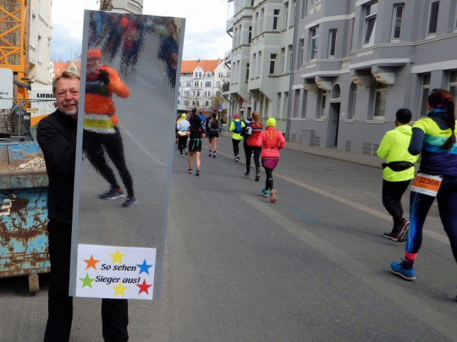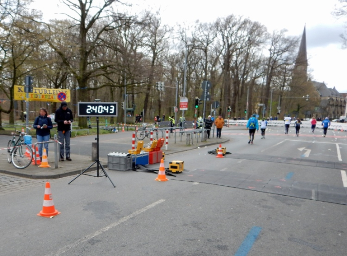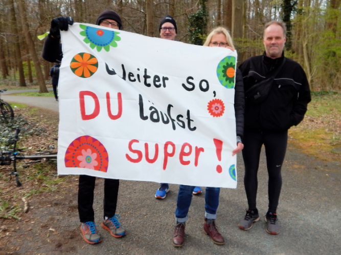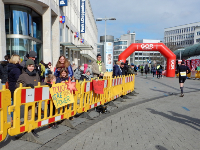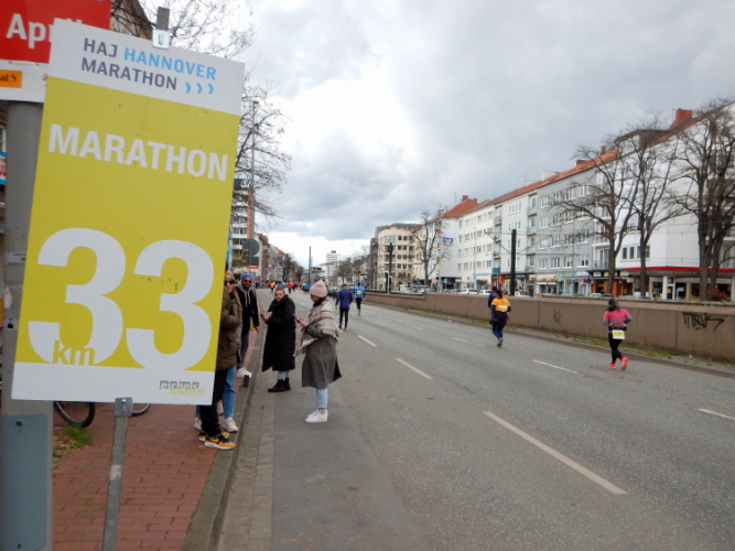 Ein wenig frustriert reihe ich mich wieder ins Feld ein und versuche Tritt zu fassen. Zwei Kilometer später, nun am nördlichen Rand des Stadtwaldes, gelingt mir das ziemlich gut. Auch hier sind aufmunternde Transparente und Zurufe Standard. Immerhin ist es nur noch der Rücken, der mich ein wenig einschränkt, das ist erträglich.