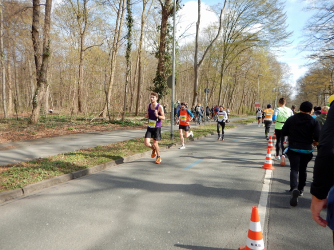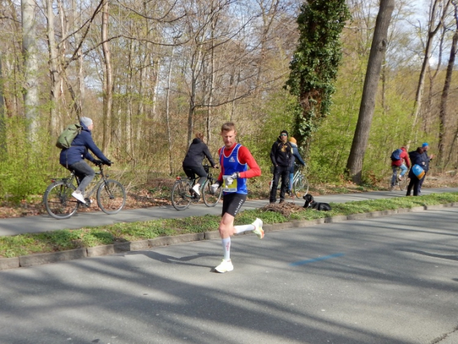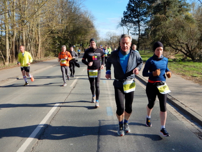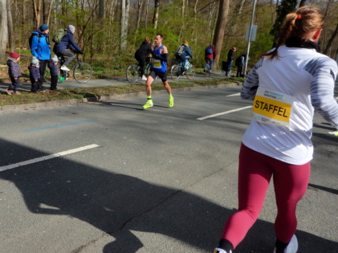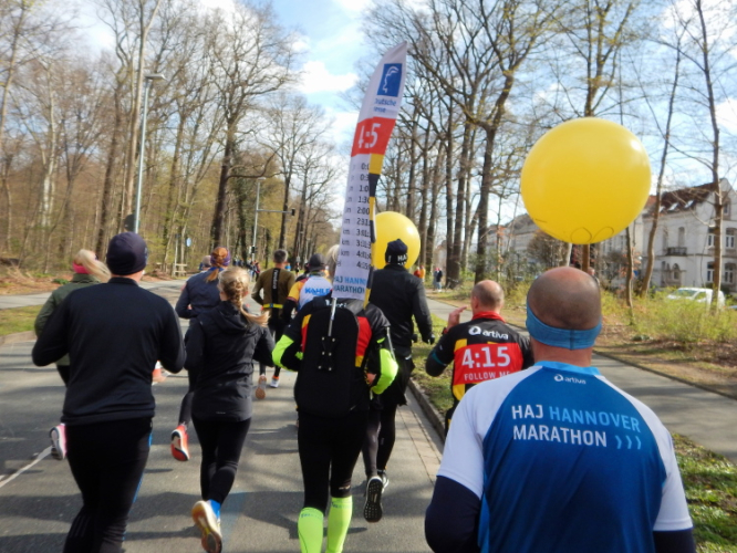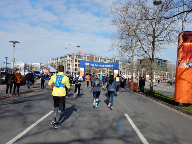 Was auf der Karte Furcht einflößen kann, ist in echt ganz angenehm zu belaufen. Die Hildesheimer Straße führt bolzengerade zurück in die Stadt, doch diese mehr als fünf Kilometer lassen keine Langeweile aufkommen. Es sind nicht zu viel Läufer auf der Strecke und nicht zu wenig. Die von hinten kommenden Staffelteilnehmer ziehen ungehindert vorbei und ziehen mit. Zwischen den Häusern und der Straße steht ein Baum am anderen, überall stehen Gruppen von Menschen und feuern an, auf den Grünstreifen blühen Hundertschaften von Narzissen. Zusammen mit vielen anderen freue ich mich darüber, dass wir von der Pandemie-Leine gelassen wurden und endlich wieder Frühlings-Marathons im großen Stil laufen dürfen.