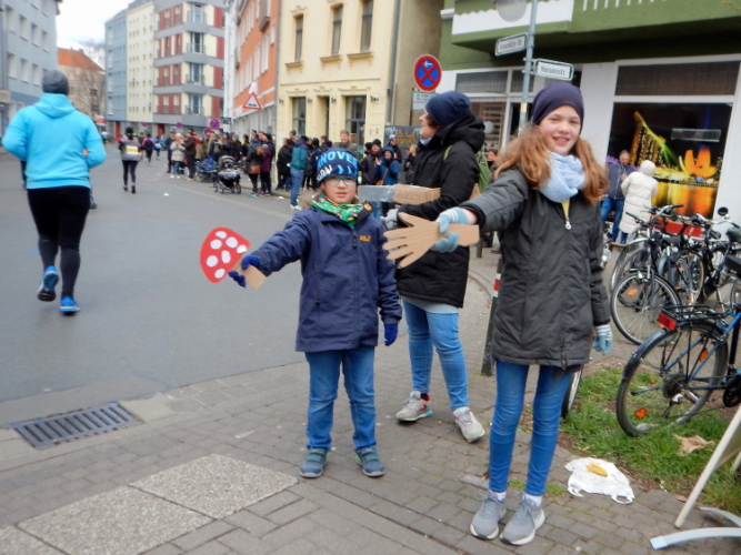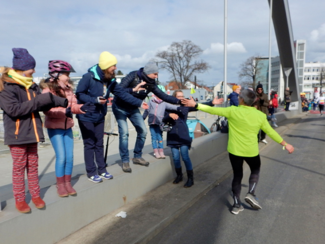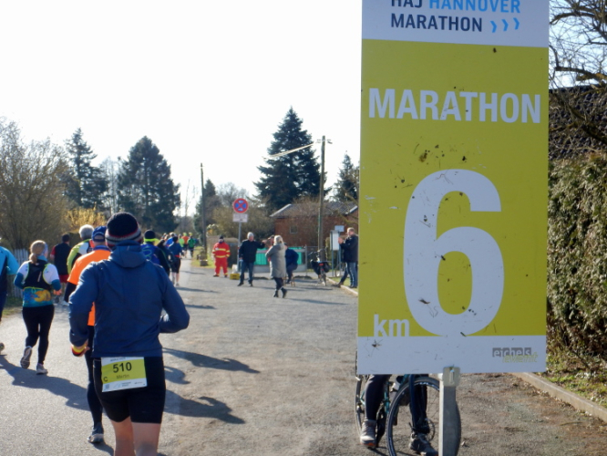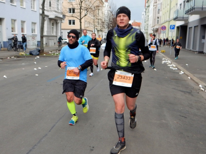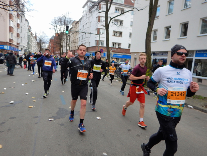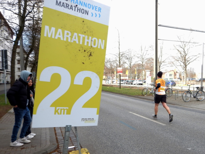 Die Nordstädter lassen sich von den tiefen Temperaturen nicht abhalten und bereiten den Tausenden, die in mittlerweile unterschiedlich gezeichneten Laufstilen vorbeiströmen, einen warmen Empfang. Neben der Sonne fürs Gemüt gibt es auch das Original. Beim Welfengarten hüllt sie mich von einem Moment auf den anderen in ihren warmen Schein. Die dunkeln Wolken rechts lasse ich beim Einbiegen auf die Nienburger Straße hinter mir.