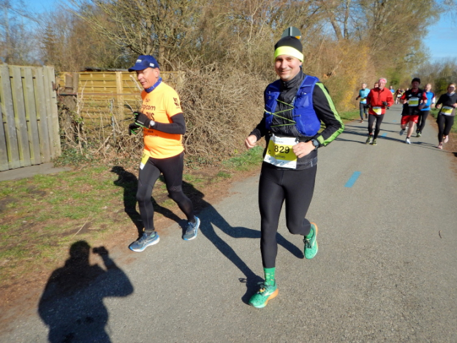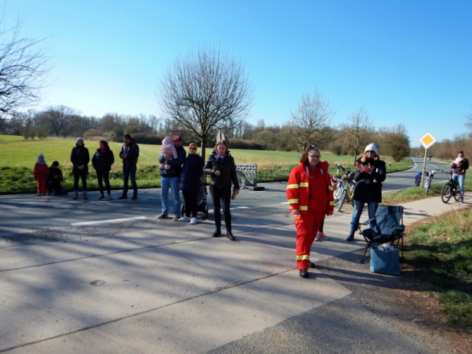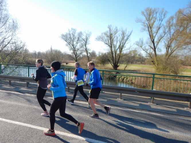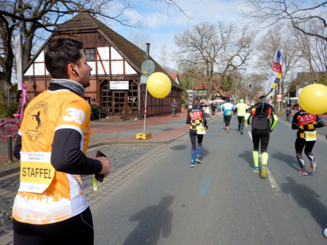 Erneut geht es über die Leine und bald wieder in besiedeltes Gebiet. Auf der einzigen nennenswerten Steigung kommt ein Pulk von Staffelläufern auf dem Weg zum Übergabepunkt entgegen.
