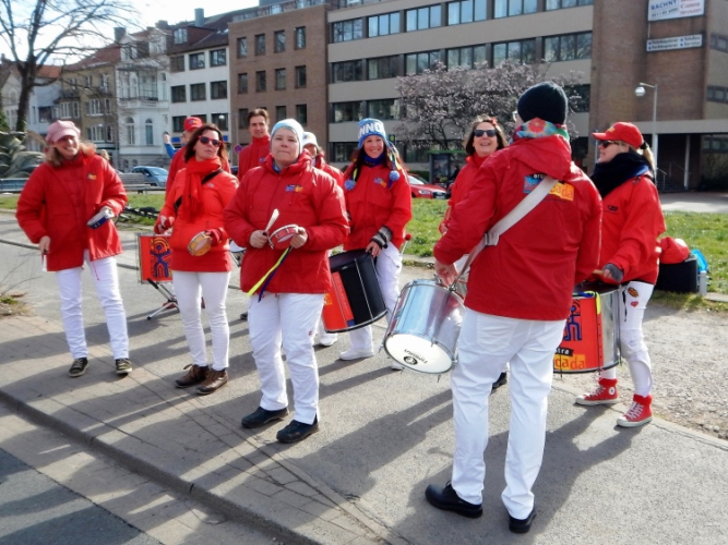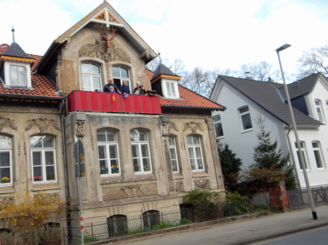 Mit dem Blick nach vorne übersehe ich beinah die Gilde Brauerei. In Sachen Durst habe ich keinen Grund, besondere Aussicht danach zu halten, denn bisher gab es genug Tankstellen. Eine sanfte Krümmung der gestrichelten blauen Linie führt, zurück in der Stadt, über den Aegidientorplatz. Wie viel besser er mir heute gefällt. Gestern ächzte er wegen den Aufbauarbeiten für den Marathon unter akuter Verkehrsüberlastung. Zweimal zwei Spuren aus zwei Richtungen, die sich hinter zwei Ampeln auf kürzester Strecke auf eine der äußeren Spur verengen, haben einige Nervenkostüme von Automobilisten zerfetzt. Heute laufen wir ganz entspannt und von einer Gruppe von Cheer Leaders angefeuert unter dem Bogen bei der Ampel durch.