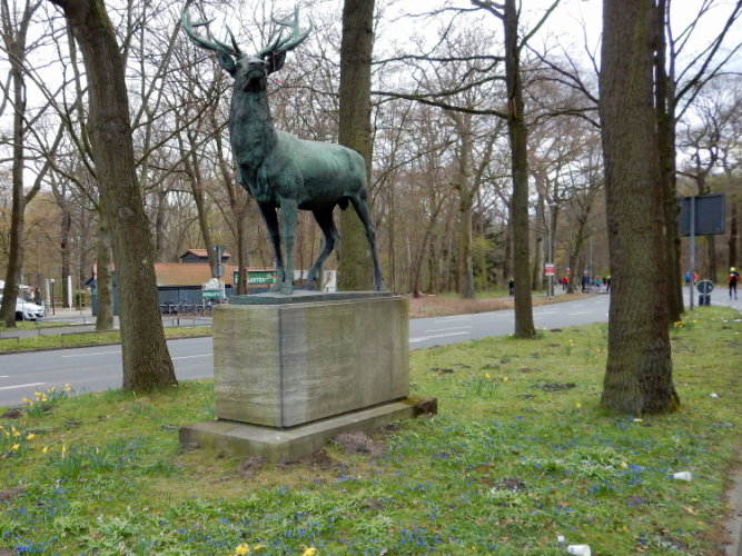 Nach dem nächsten Verpflegungsposten (schon wieder) und der Zeitmessmatte bei Kilometer 25 geht es links ab, quer durch den Stadtwald. An der Kreuzung steht im Grünstreifen eine denkmalgeschützte Hirschplastik des von 1903 bis zu seinem Tod im Jahre 1947 in Hannover ansässigen Künstlers Alfred Waterbeck.
