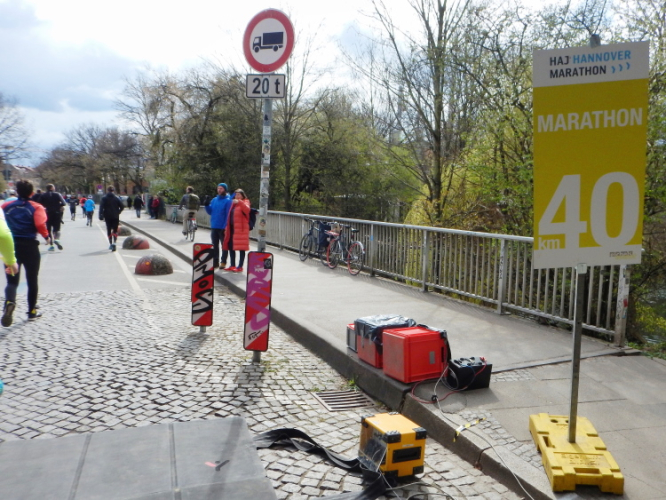 Die Uferstraße ist von Bäumen gesäumt, von der Löwenbastion an sind beidseits Grünflächen bis zum unteren Ende des Maschsees. Viel erwachendes Grün für eine Stadt – und es geht so weiter. Ein Teil der wenigen Höhenmeter der Strecke bestehen aus einer Brücke, über welche auf die andere Seite der Leine gewechselt wird. Es geht mit den Ingredienzen eines Naherholungsgebietes weiter, Bäume, ein Kleingärtnerverein (in welchem eine schwarze Fahne mit der weißen Aufschrift „Nen Scheiß muss ich“ gehisst ist), ein Feld zur Linken, leichte Bewaldung rechts und bei der Abzweigung auf die nächste Straße ein Pulk von Zuschauern, welche mit ihren Fahrrädern hergefahren sind.