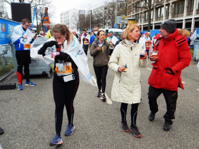 Bis oben voll mit Eindrücken und frisch eingehüllt in ein Plastikhaut nehme ich die aus Holz gefertigte Medaille des dreissigsten Hannover Marathons entgegen und schlendere weiter in den nicht nur räumlich grosszügigen Verpflegungsbereich, wo gesalzene Brezelsnacks, Kuchen, Riegel, Wasser, Bleifreies und noch mehr angeboten werden.