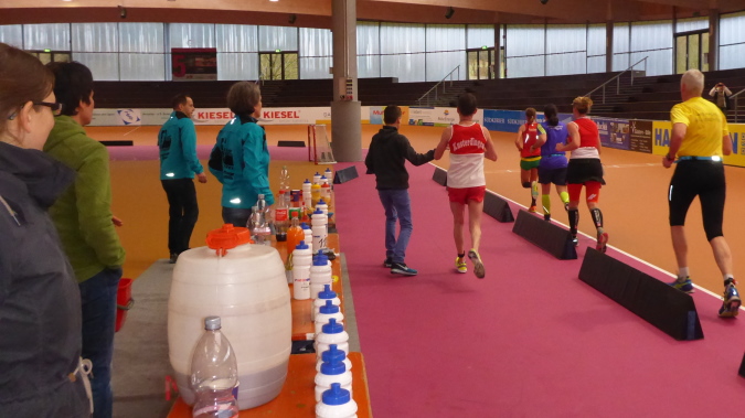 Fazit: Ein Marathon in der Halle bietet viele Vorteile: keine Streckensperrungen, nur ein Verpflegungspunkt, keine Witterungseinflüsse. Auch eine optimale Renneinteilung ist möglich, da man seine Mitläufer stets im Blick hat und auf der Tafel deren Platzierung mitverfolgen kann. Natürlich besteht hier die Gefahr, am Anfang zu schnell anzugehen. Wenn man es jedoch schafft, sein eigenes Rennen zu laufen sind durchaus persönliche Bestzeiten möglich.