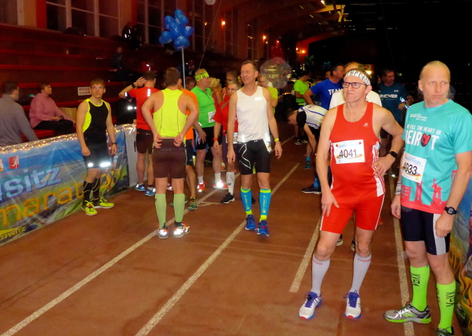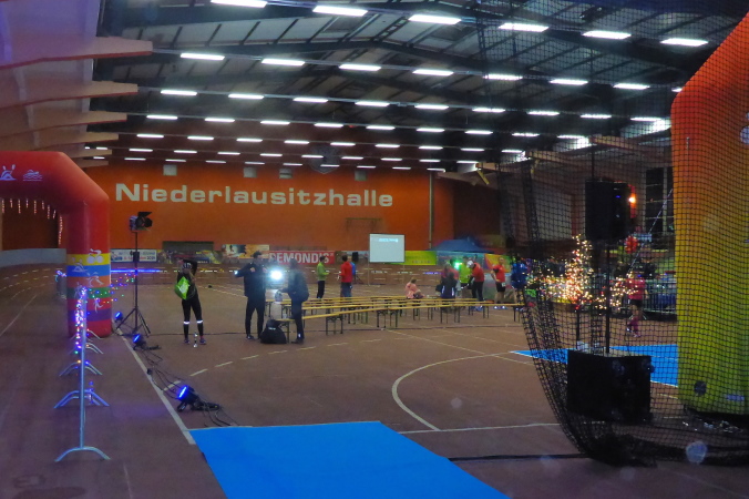Ich beziehe zuerst mein Zimmer in einer kleinen Pension in der Stadt, um dann meine Startunterlagen in der Halle und die ersten Eindrücke abzuholen. Als ich eintrete, läuft gerade das 3000 m Rennen zusammen mit ordentlicher Rockmusik und man ist sofort mitten im Geschehen. Etwas nostalgisch wirkt der Charme der unter Denkmalschutz stehenden Halle und mit Gänsehaut freue ich mich schon jetzt, hier gleich laufen zu dürfen - bei angenehmen Temperaturen im Trockenen, während ich draußen Schnee und Kälte zurück lasse. Die Startnummernausgabe ist gut organisiert, viele helfende Hände sind zu sehen. Startnummer und einen Transponder von Lausitz-Timing gegen 20 € Pfand gibt es im Umschlag ohne Schnick-Schnack und Werbung. Ich schieße die ersten Fotos und der Test mit dem Blitz lässt schon erahnen, dass ein Bild mit einem Läufer in Bewegung bei den Lichtverhältnissen und mit Blitz eine große Herausforderung sein wird.