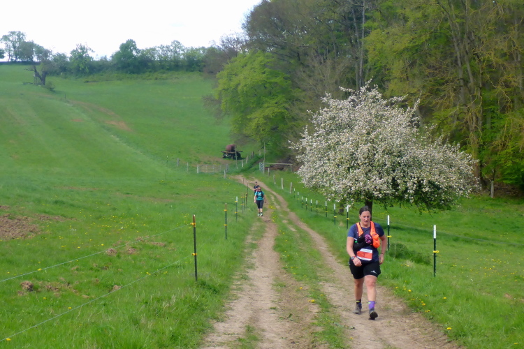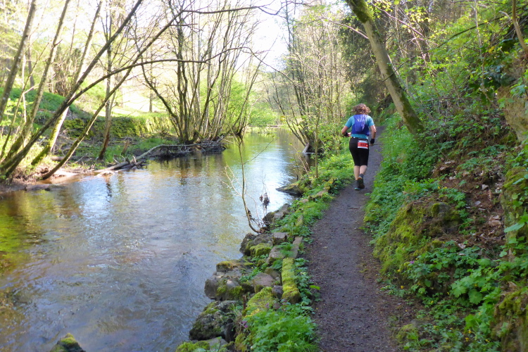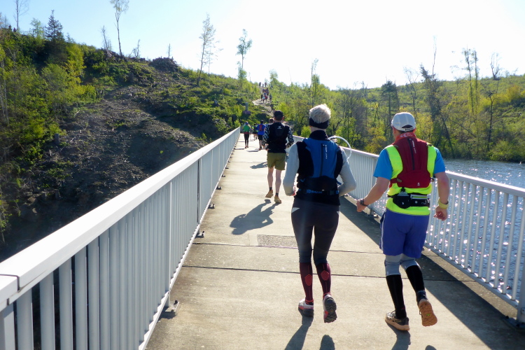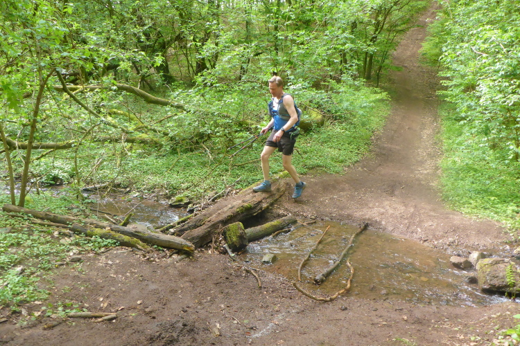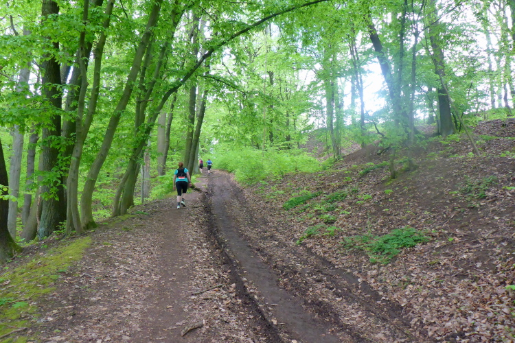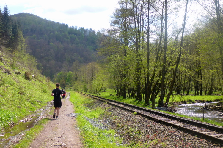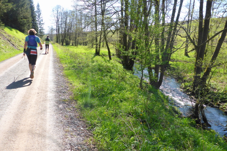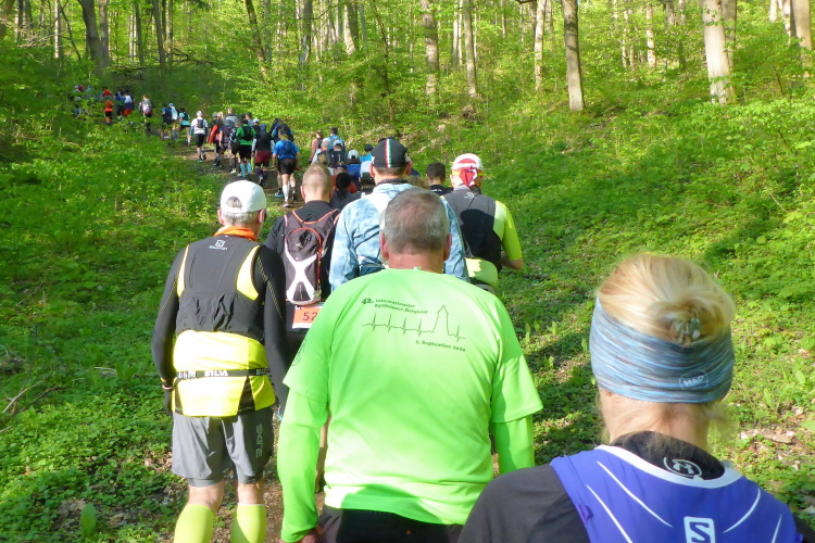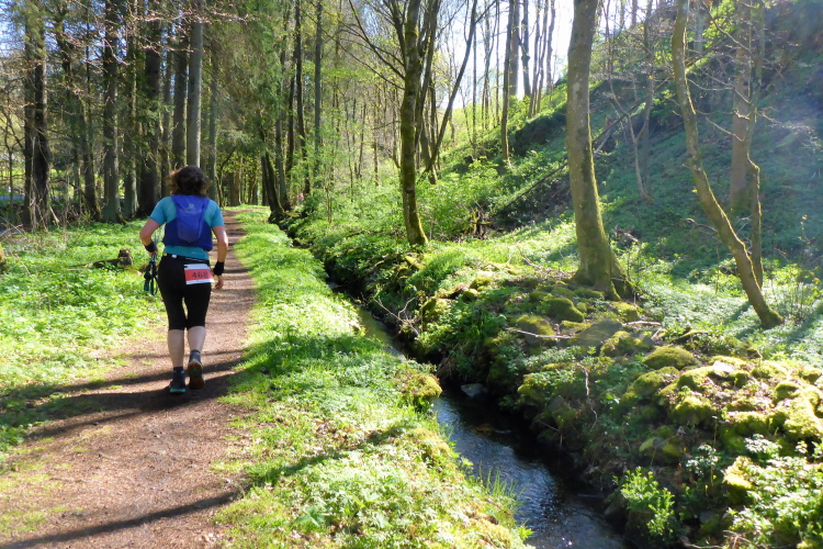 Pünktlich ertönt der Startschuss und viele hundert Menschen laufen in den Wald hinein. Während der ersten halben Stunde ist das Feld noch recht eng, zweimal gibt es sogar kurz Stau, aber wir haben ja reichlich Zeit. In einer Mischung aus Laufen und Wandern geht es zuerst bergauf, bald aber auch schon wieder abwärts. So abwechslungsreich bleibt es auch den Rest des Tages über. Heute dürfen wir bei idealer Temperatur viele Stunden Sonnenschein genießen. Ein Trail durch sonnigen Buchenwald führt uns hinab ins Kalte Tal und über eine kleine Brücke. Danach zieht sich die Menschenschlange auf einem etwas steileren Trail wieder bergauf und durch einen kleinen Hohlweg.