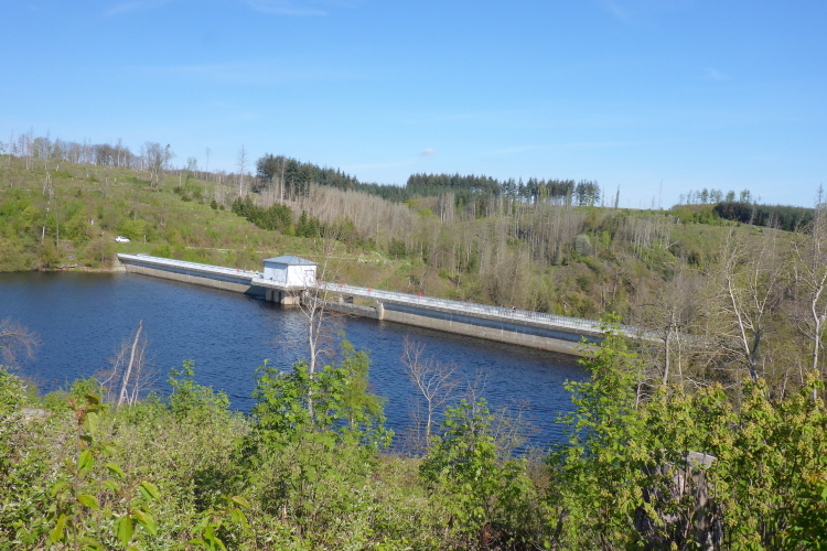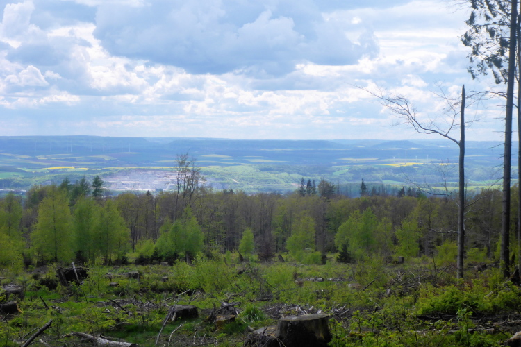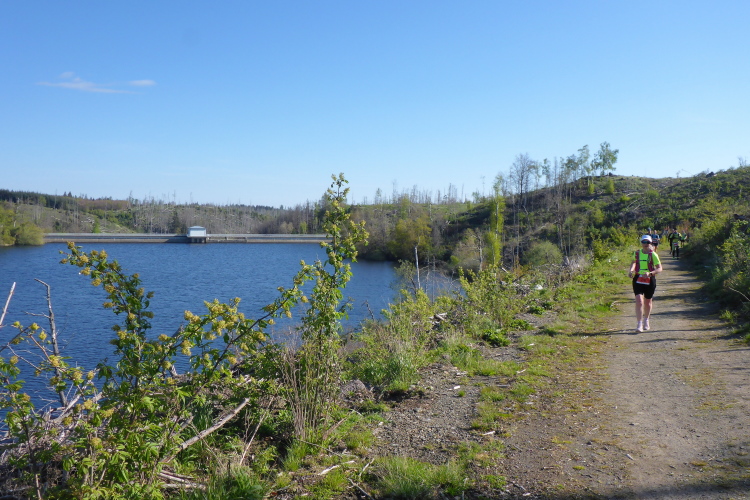 Eine Weile laufen wir bequem oberhalb des Ufers weiter. Dann umgibt uns oben auf dem Kunstberg wieder ein ehemaliger Wald, von dem nur noch ein paar vereinzelte Bäume stehen geblieben sind. In der Ferne sehen wir den Gipfel des Brocken, wo auch jetzt Ende April noch Schnee liegt. Mitte Februar 2024 erlebten die Teilnehmer der legendären Brocken-Challenge das normalerweise gewohnte Eis- und Schneeparadies auf dem kältesten Berg Norddeutschlands komplett schneefrei - für mich so unvorstellbar wie Glühwein im August!