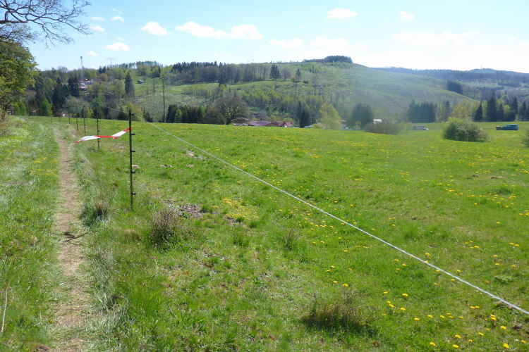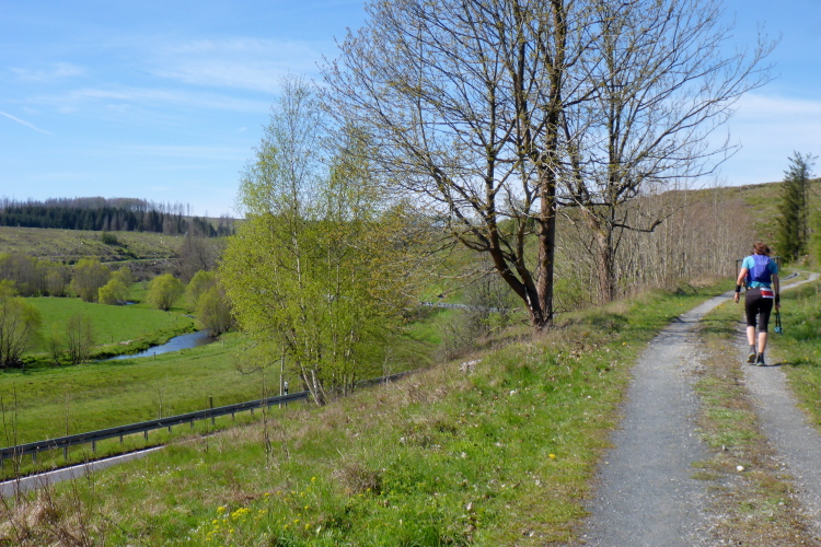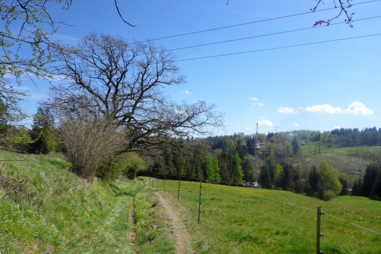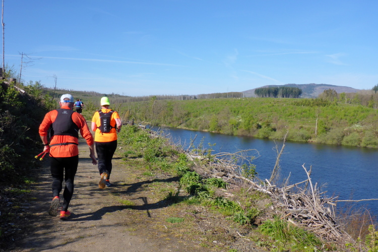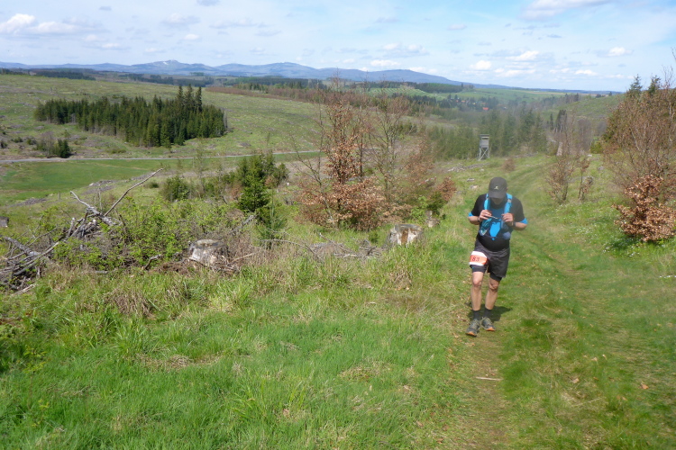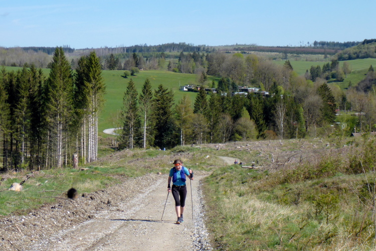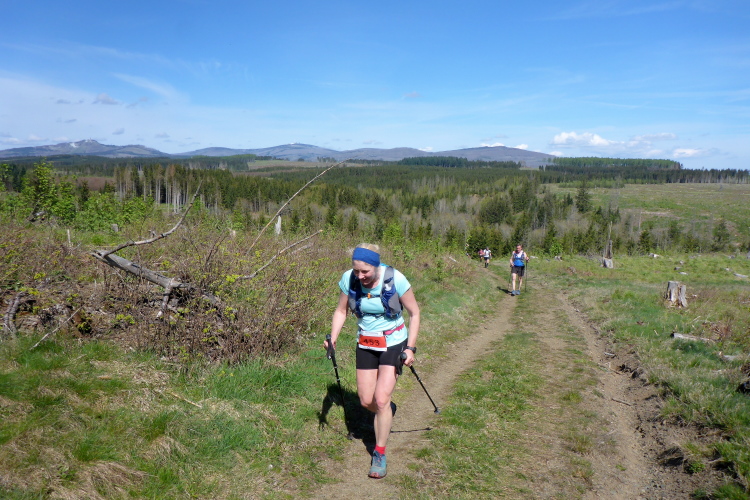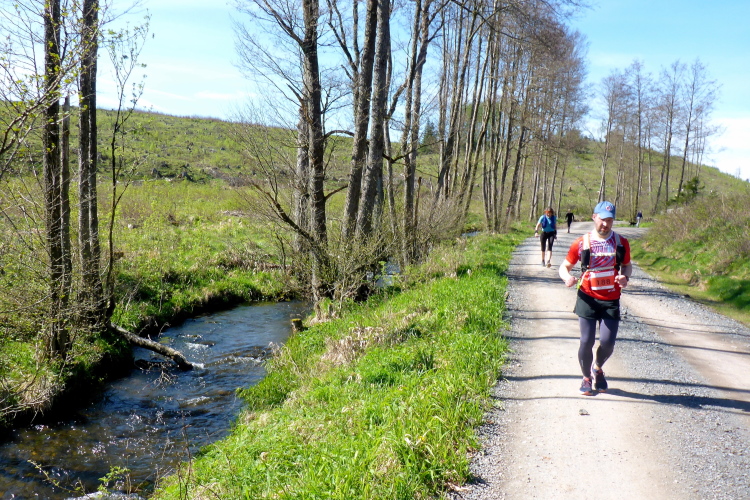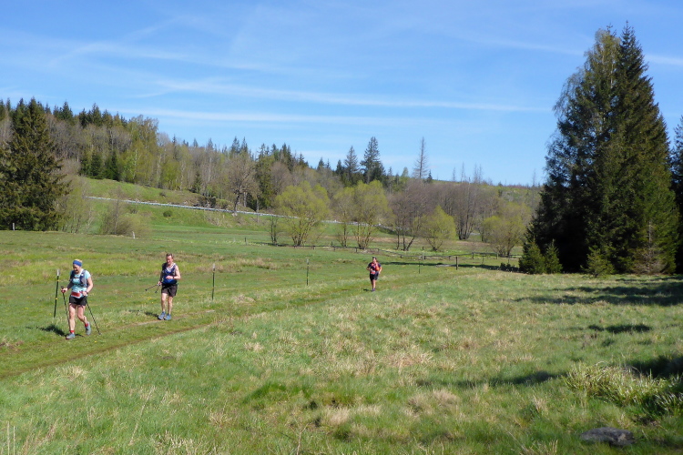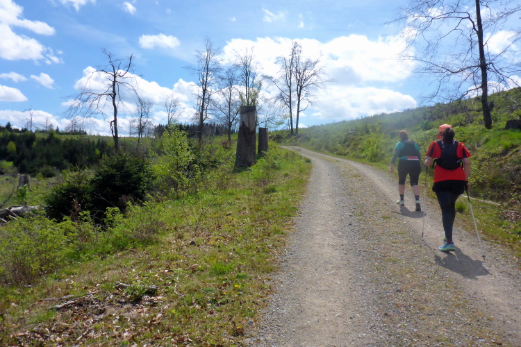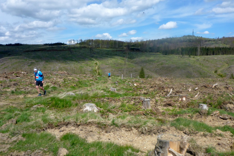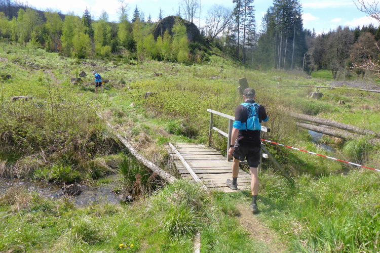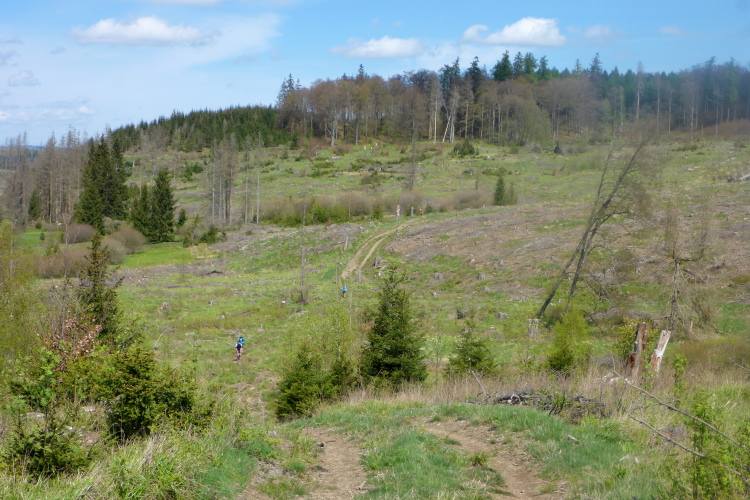 Mal auf breiten Wegen, mal auf Trails laufen wir nun oft über Wiesen, immer wieder mal entlang hübscher Bäche. Dann marschieren wir auf einen Berg, bei dem der Kahlschlag noch nicht so lange her ist, also noch kein frisches Grün nachwachsen konnte. Die Trails durch diese Natur im Wandel sind faszinierend.