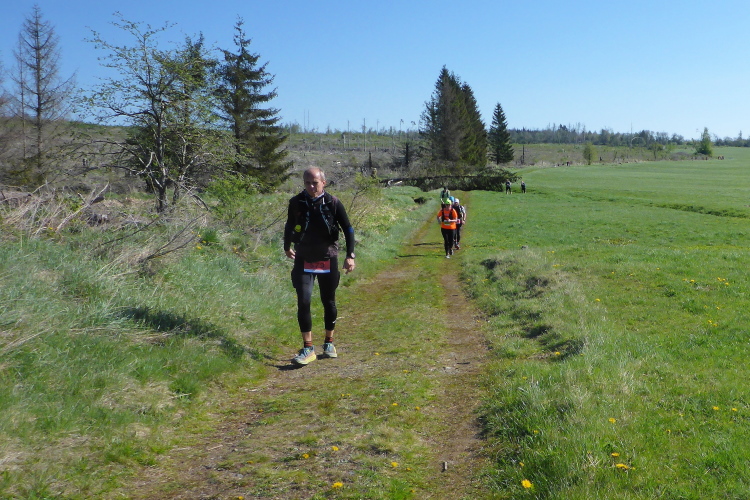Mit einem Wechsel aus Genusslaufen und flottem Marsch überhole ich in dieser idyllischen Umgebung nun viele Wanderer. Bei der letzten Getränkestelle zeigt ein Schild an „Leider nur noch 3,5 Kilometer.“ Dies ist zwar nicht mehr weit, doch zuerst muss ich nun wieder stramm bergauf marschieren. Erst die letzten zwei Kilometer laufe ich dann auf relativ einfachen Wegen über Wiesen bergab.