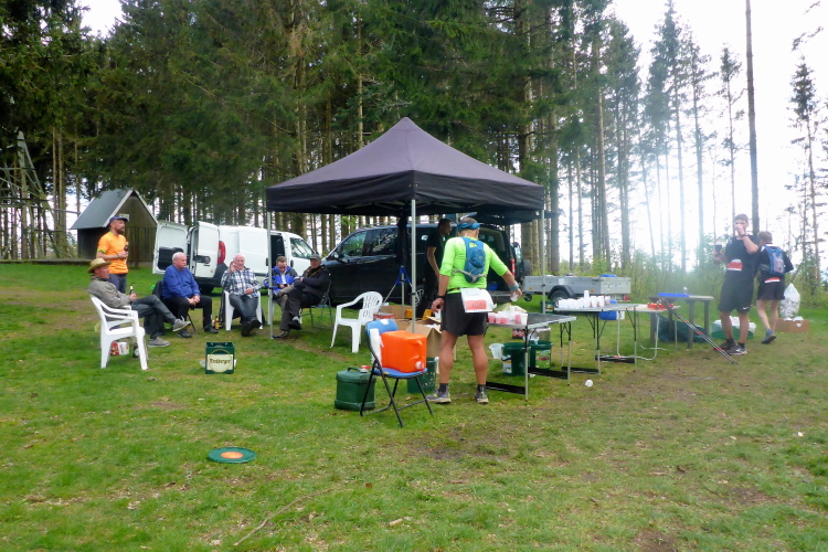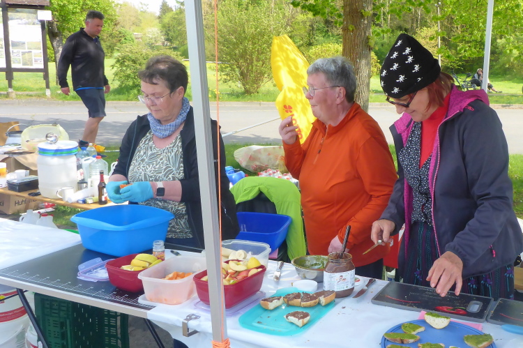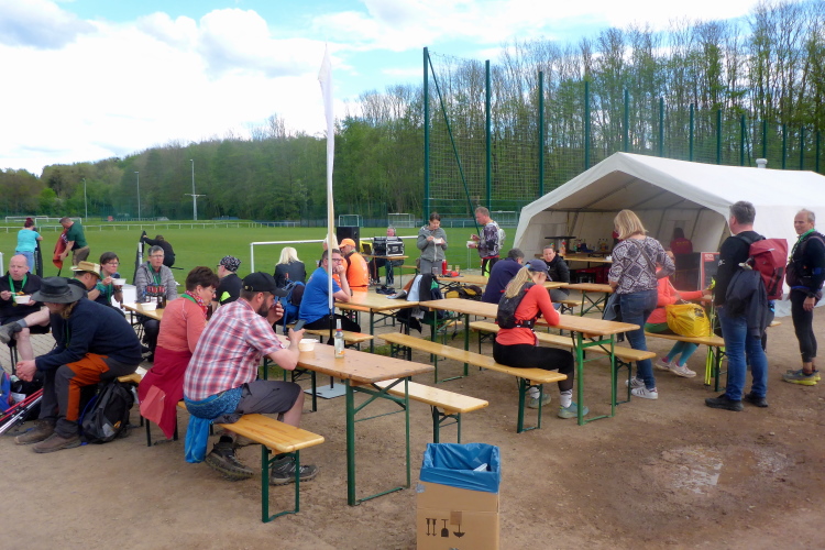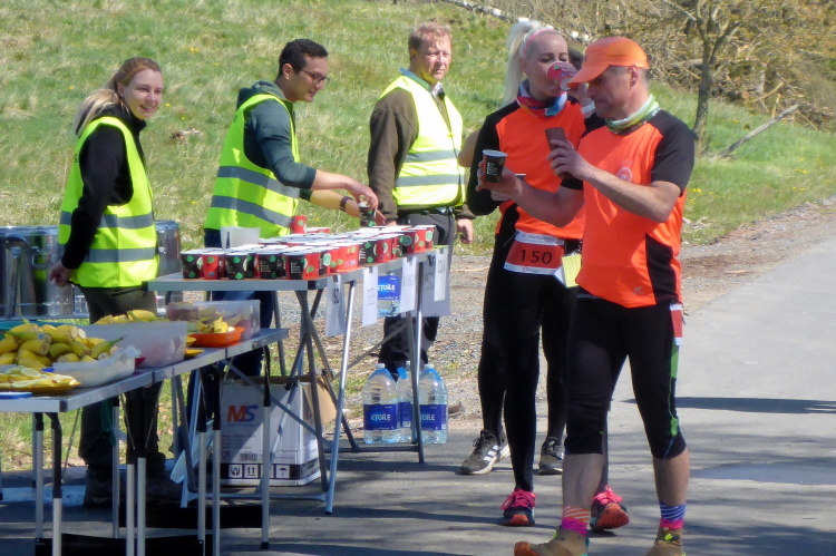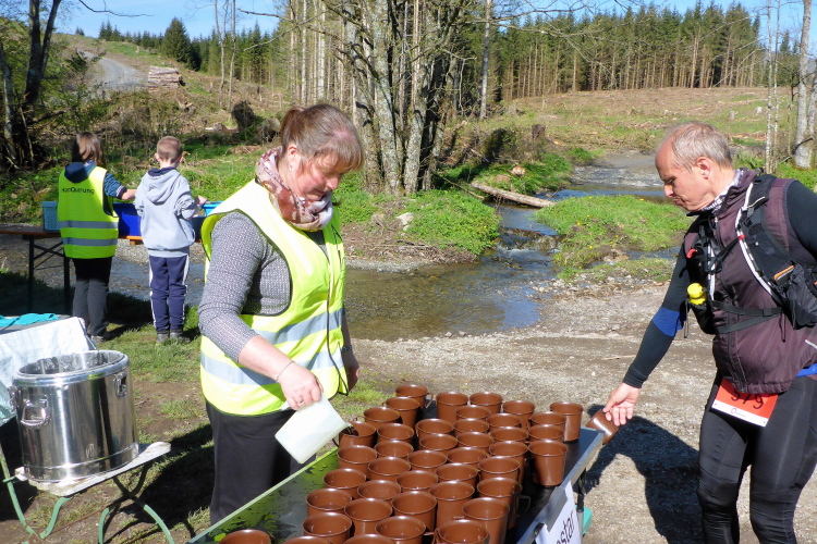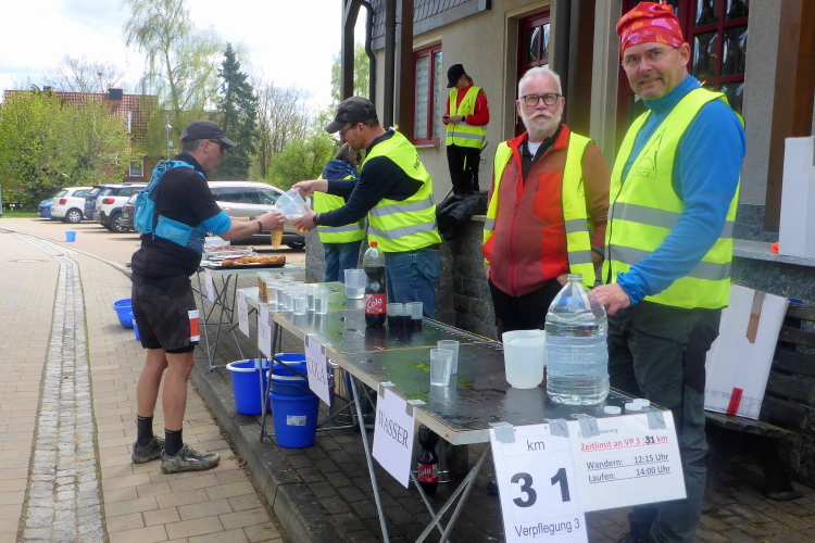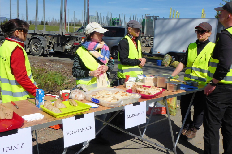 Dann folgt ein Abschnitt über sonnige Wiesen. Unten im Steinbachtal steht die erste Verpflegungsstelle. Hier wie auch an den anderen gibt es unter anderem Schmalz- und Margarinebrot, Vegetarisches, Obst und Salz. Auf Plastikmüll wird verzichtet - die wieder verwertbaren Becher werden an Ort und Stelle gespült.