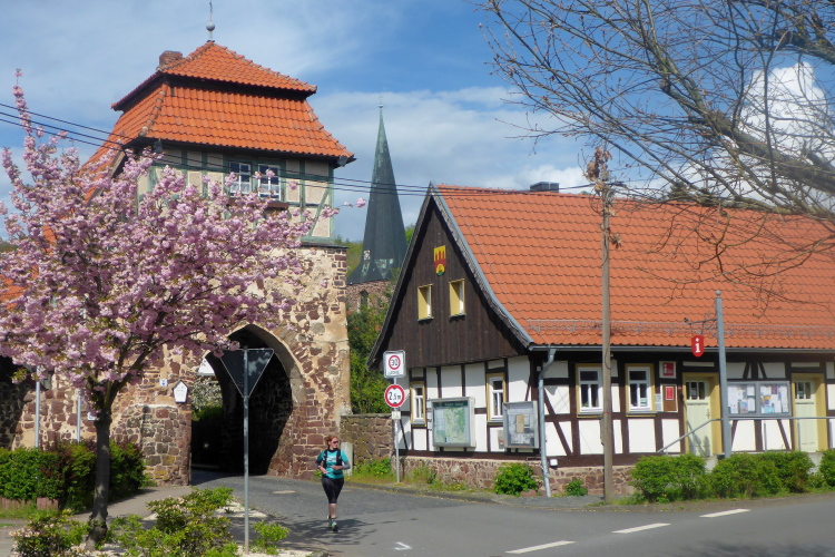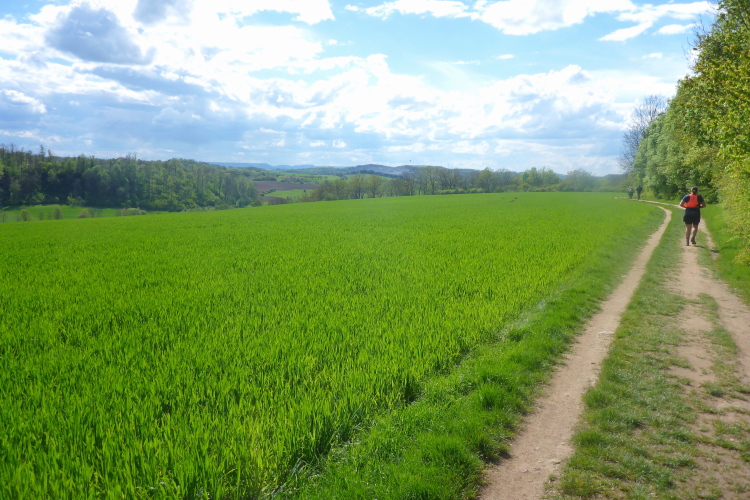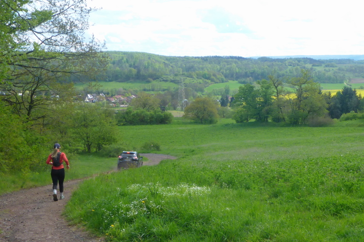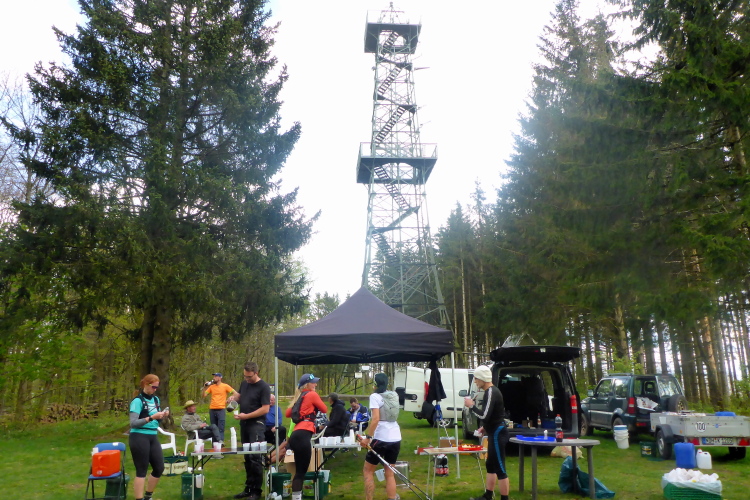Nun folgt ein besonders langer Aufstieg. Da hier Buchenwald anstatt der Fichtenwälder wächst, wirkt die Natur um mich herum nun intakt. Auf dem 601 m hohen Poppenberg steht vor dem Aussichtsturm für uns eine Getränkestelle. Einige Kilometer weit kann ich nun auf meist recht leichter Strecke bergab laufen.