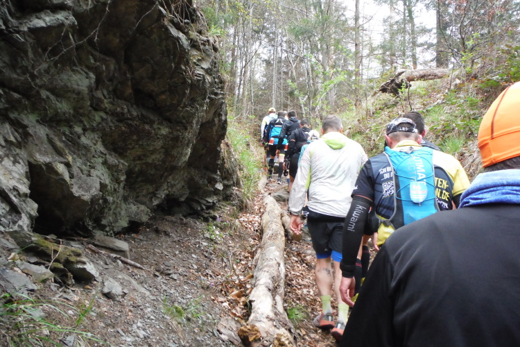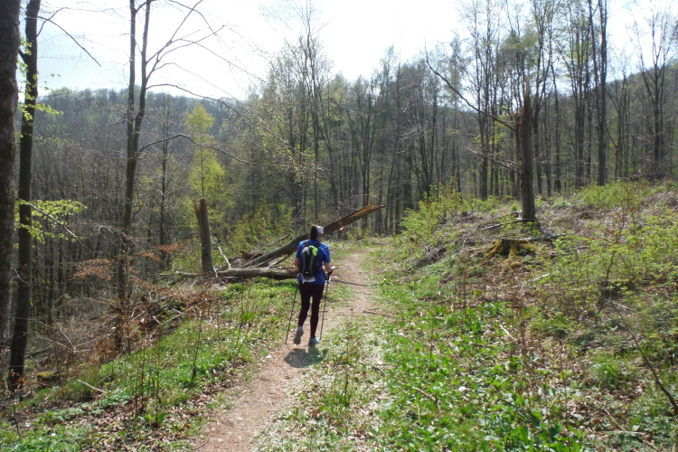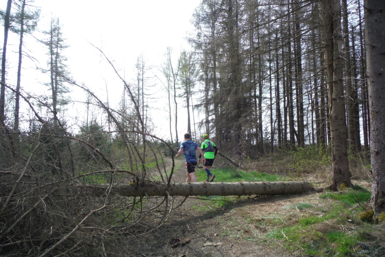 Die Strecke bleibt so abwechslungsreich wie bisher. Ein angenehmer Mix aus Wald, Wiese und gerodeter Fläche, über Brücken und umgestürzte Bäume. Letztere bietet Ausblicke, die früher verwehrt blieben. So ist zurückschauend immer noch der Brocken zu erkennen. Die jungen Leute vor mir haben die kurze Strecke über 25 KM gewählt. Diese wird neben dem Ultra und einem 28 KM-Lauf zusätzlich angeboten. Wer die Strecke wandern will, kann sogar eigenständig früher starten. Nach der Verpflegung bei KM 20 teilt sich die Strecke und ich folge dem Weg in Richtung Nordhausen.