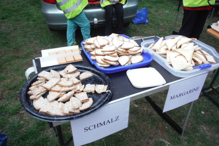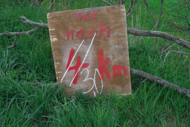 Über weite Felder und kurze Straßenabschnitte erreichen wir die letzte Getränkestation. Auftanken für den Zielspurt. Als Rest-Kilometer sind auf dem Schild 4 angezeigt, oder sind es wie korrigiert nur noch 3? Es ist bei einer Laufuhr, der man auch nicht 100 % trauen kann. Meiner heute schon, wie ich im Ziel noch feststellen werde, denn sie zeigt nur wenige 100 Meter mehr als die offizielle Strecke an. Also, nichts wie weiter, wenn auch noch einmal gehend, denn die Steigungen scheinen heute kein Ende zu nehmen.