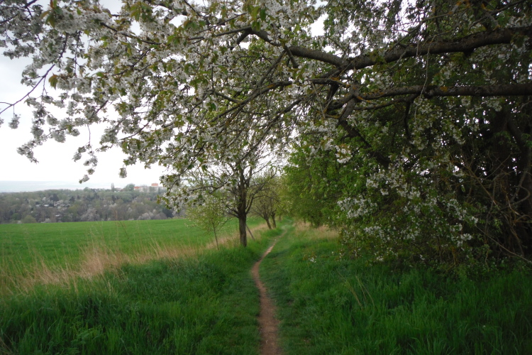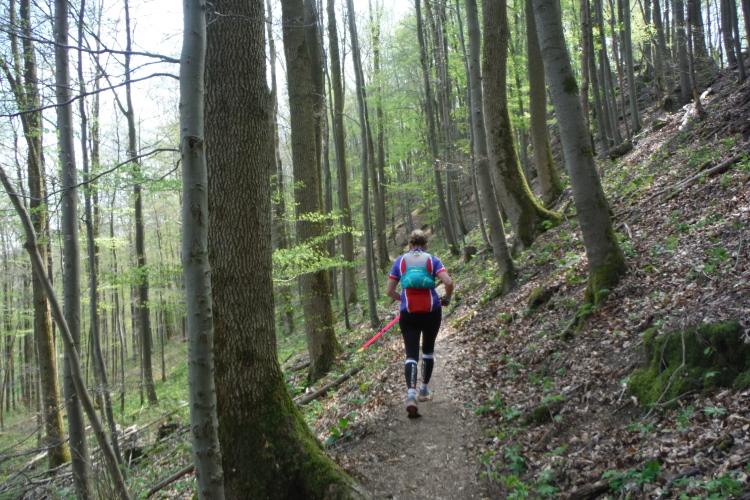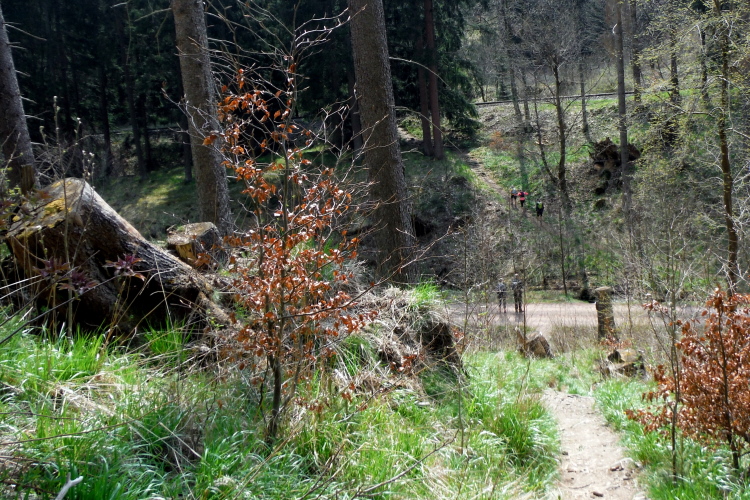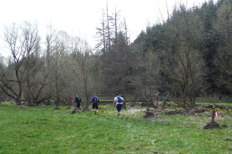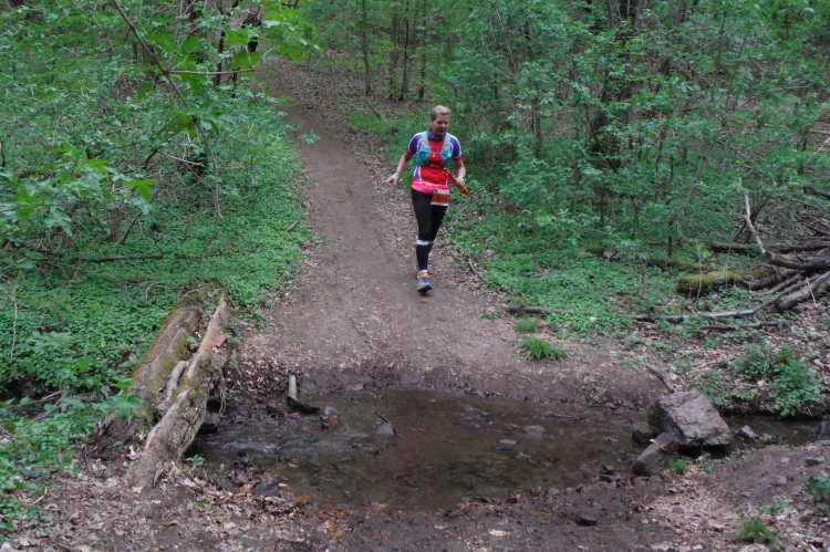 Bei KM 11,3 wartet die erste Verpflegungsstelle. Aufgetischt wird reichlich. Neben Schmalz- und anderen Broten u. a. die üblichen Bananen, Mandarinen und Zitronen. Den Durst kann ich mit Wasser, Iso, Cola und Tee stillen. Gut so, denn der Wetterbericht war zwar nicht so berauschend, aber zwischen den Wolken kommt ab und zu die Sonne heraus. Durch den Wald wartet nach wenigen Kilometern bereits die Bode, ein 169 km langer Zufluss der Saale, der ich ein kurzes Stück folgen darf. Erst noch recht offen durch eine blühende Wiese, dann durch ein enger werdendes Tal. Erinnert mich an meinen Ottonenlauf letztes Jahr durch das nahe gelegene Selketal. Kaum zu Ende gedach,t hat die Pracht ein Ende und über die Bode hinüber kraxele ich hinauf in Richtung Kapitelsberg.