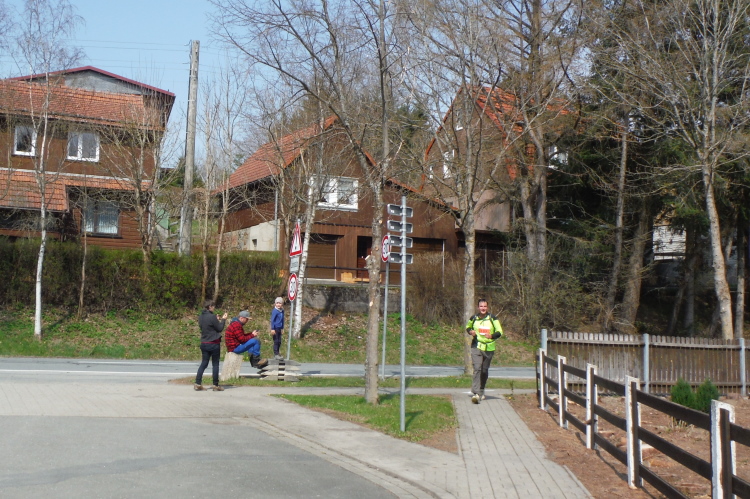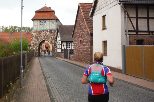 Es läuft wieder etwas runder, vorbei an blühenden Obstbäumen durch grüne Wälder über lauschige Bäche. Über das Feld grüßt das nächste Etappenziel, Neustadt / Harz, Ortsteil der Gemeinde Harztor. Bald haben wir den Harz gequert. Der Ort ist alt, wurde schon 1372 erstmals erwähnt. Zeugen längst vergangener Zeiten sind die Kirche St. Georg und das schön zu durchlaufende alte Tor. Kurz bevor wir den Ort verlassen, jubelt uns noch Karins Fanclub zu.