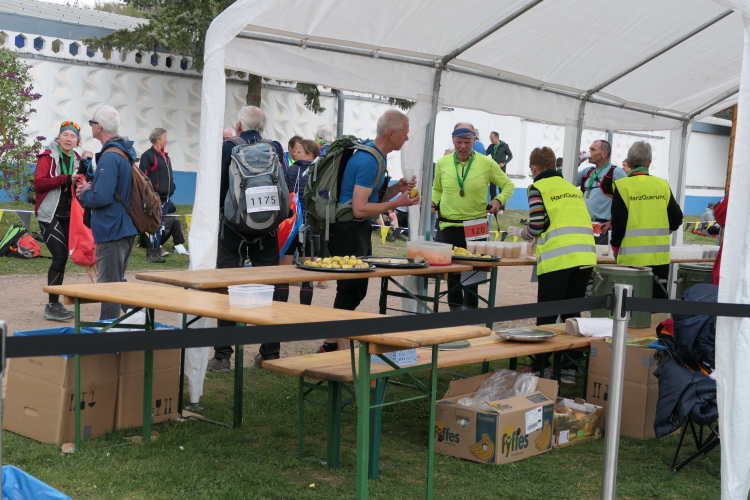 Im Zielbereich bekomme ich zum Ende der gut organisierten Veranstaltung noch meine Medaille und einen Aufnäher. Zudem lässt die Verpflegung auch hier nicht zu wünschen übrig.