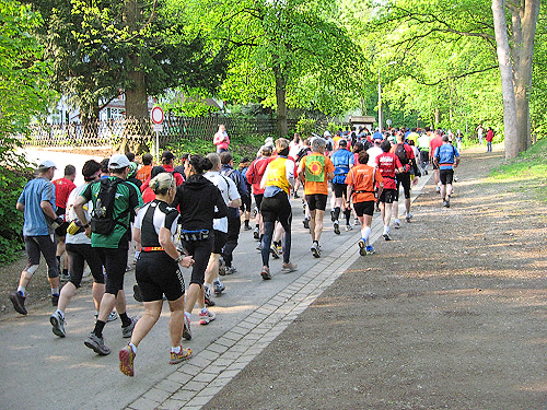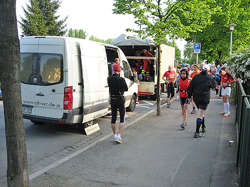 Entlang der Strecke sind in Abständen von jeweils etwa 10 Kilometern insgesamt vier Verpflegungspunkte aufgebaut, an denen es Schmalz- oder Butterbrote, Äpfel, Zitronen oder, ganz lecker, Orangenscheiben gibt. Auch bei den Getränken gibt es alles, von Tee bis Cola. Die Strecke ist gut und eindeutig markiert mit zusätzlichen Kreidepfeilen auf dem Boden.