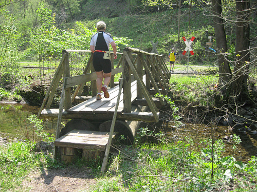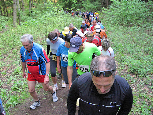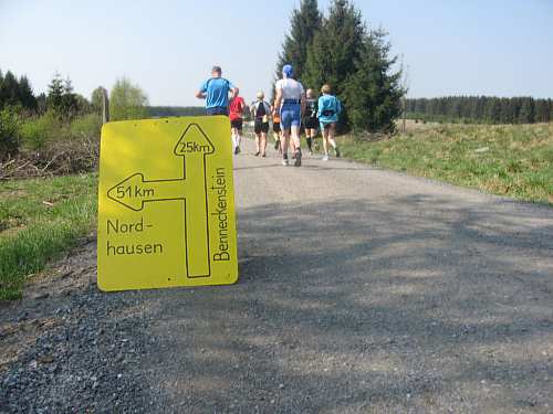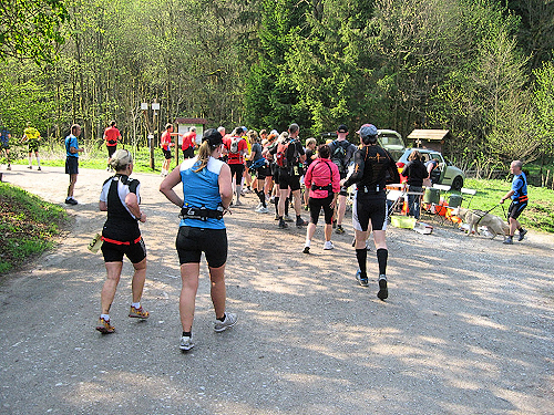Gegen 8:15 Uhr verlassen wir unser Nachtlager und geben unsere Kleiderbeutel am bereitgestellten LKW ab. Es stehen zwei LKW´s bereit. Einer für die 25 km Läufer und einer für die 51 km Läufer. Nun müssen wir nur noch ca. 300 Meter bis zur Startlinie gehen, um zu erkennen, gestartet wird gegen den Berg. Bei der Startaufstellung treffen wir Bekannte unter anderem auch Ina und Klaus, mit den wir bereits beim Bilstein-Marathon ein paar Worte wechselten. Beide nehmen die komplette Strecke, wie auch schon in Bilstein, als Walker unter die Füße.
