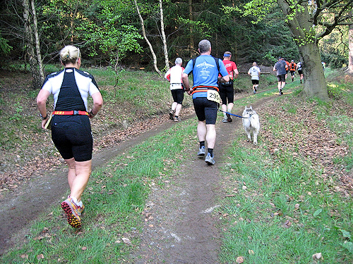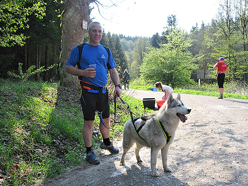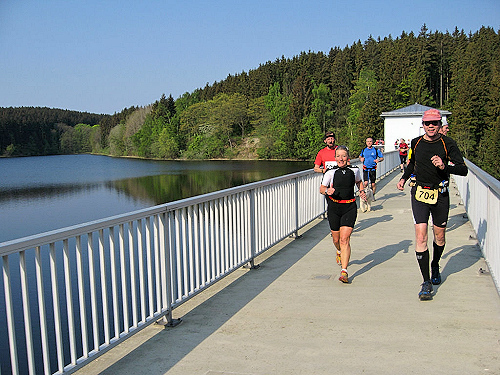 Das über 500 Teilnehmer starke Läuferfeld setzt sich langsam in Bewegung. Kein Gedrängel, kein Geschiebe, diszipliniert laufen alle hintereinander auf die erste Steigung. Man kann nicht rennen, vielleicht ganz vorne. Wir sind mal wieder sehr weit hinten und da geht es nur im Schritttempo voran – aber es machte Spaß. Hinter mir höre ich es hecheln und schnaufen dann sagt ein Läufer: „Bist du das Hans?“ Nein, es hört sich wirklich nicht gut an, es sei denn man wäre ein Hund! Ein Husky genauer gesagt, dem dieses Tempo viel zu langsam ist. Mit seiner Kraft und Power hätte er locker sein Herrchen den Berg hinaufziehen können. Aber auch die beiden müssen sich einreihen. So geht das etwa 15 Minuten und ganz langsam kann man vom Traben ins Laufen übergehen. Nach ca. 45 Minuten erleben wir das erste richtige Highlight – ein in der Morgensonne ruhig liegender Stausee – mit ein wenig Fantasie kann man sich nach Kanada versetzt fühlen.